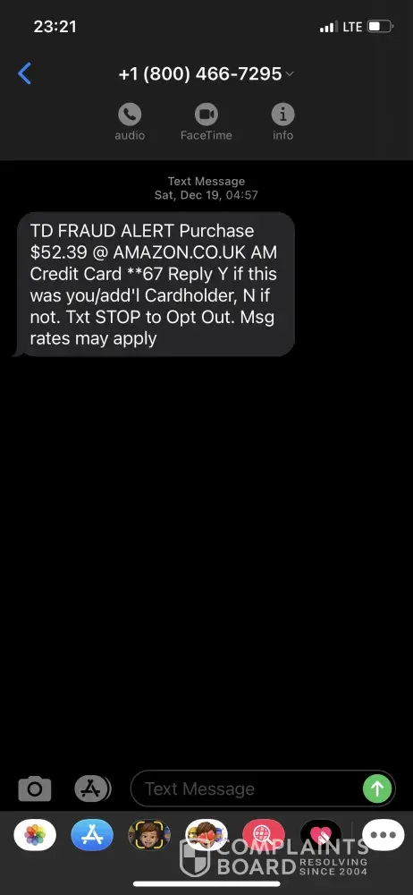 TD fraud alert purchase $52.39 @ amazon.co.uk am credit card **67 Reply Y if this was you/add'l Cardholder, N if not. Txt STOP to Opt Out. Msg rates may apply