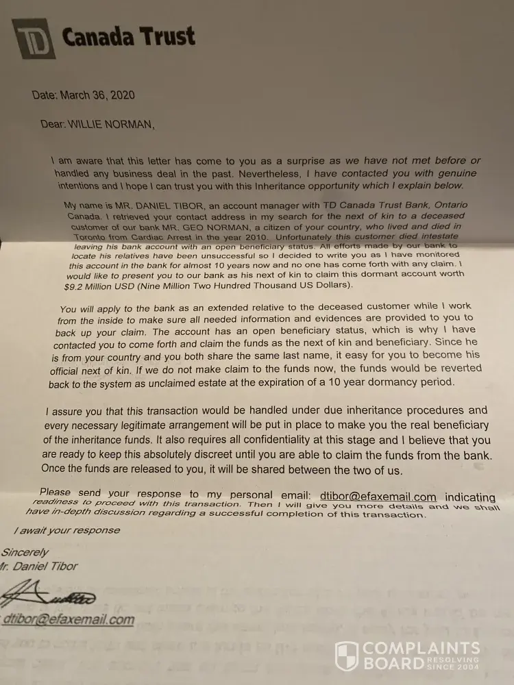 Received potential inheritance scam letter/transaction fraud