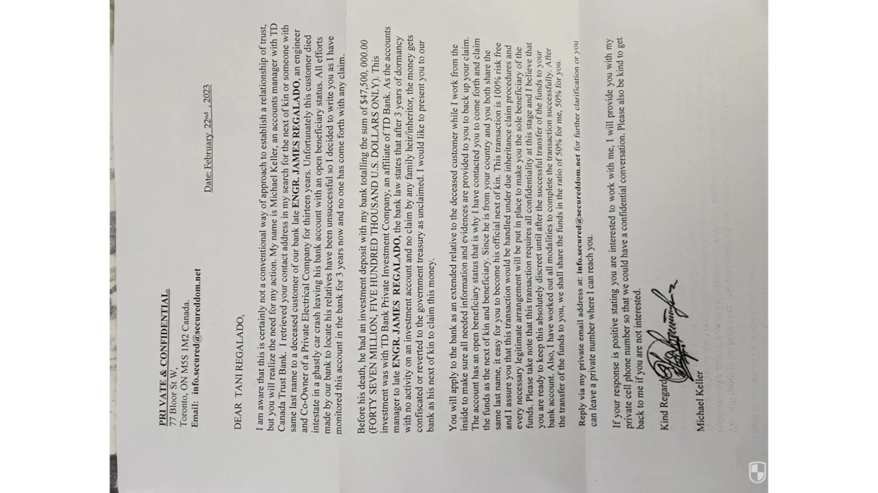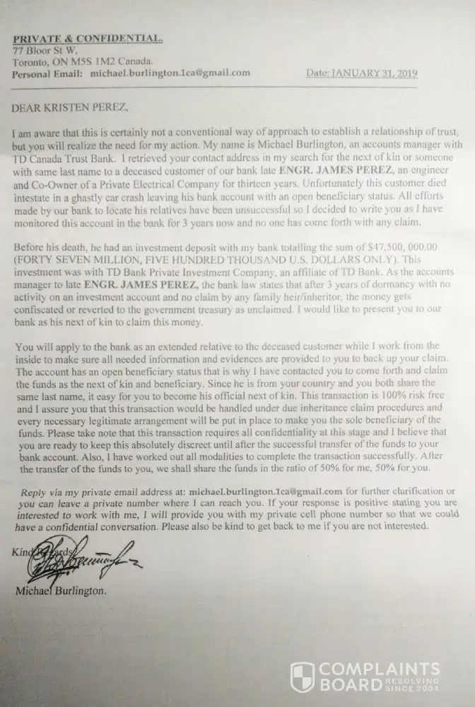 I received a letter dated Oct 10 ,2022 a Michael Torres of TD bank saying a fellow with the same last name of myself had an acct with 47,500000.00 in it needed to be claimed by an heir and you know the rest ,going to split it 50-50-people be aware this guy is a crook.