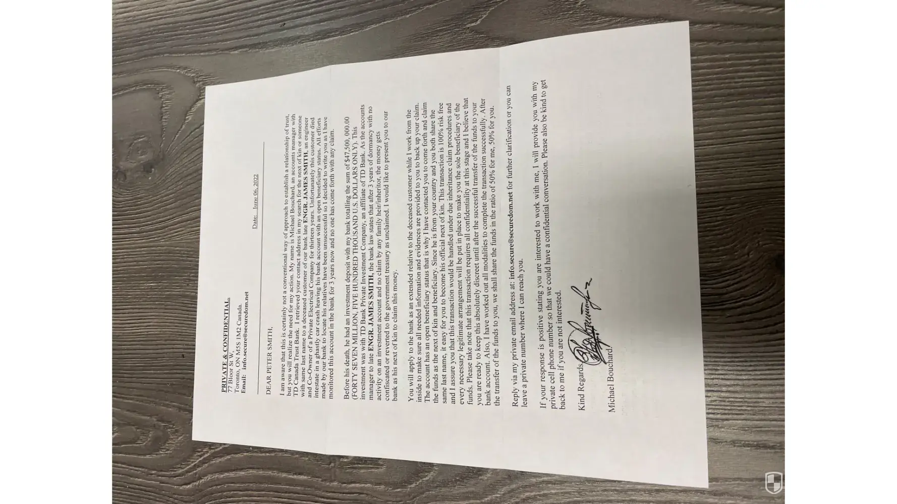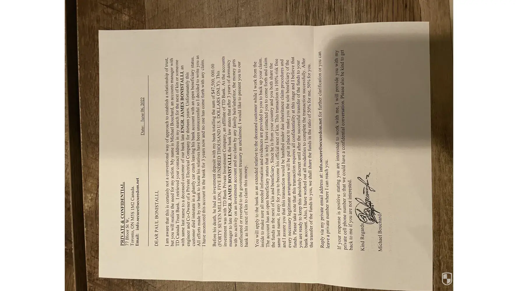 Just got the $47,500,000 inheritance letter from Michael Bouchard of TD Investments
