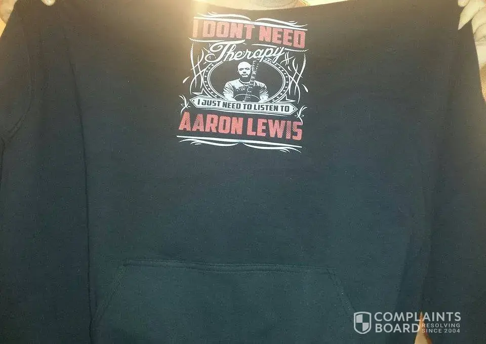 You can see in the picture I posted how small the image is compared to where the pocket is in what I thoughtwhen I first placed my order I was very excited but the next day they released the same hoodie with better colored wording. That's when I noticed the colored words that stood out the most looked like it said I don't need aaron lewis. Which is the opposite of what I wanted. I started calling the night after I placed my order (Oct. 6th) to ask if I could cancel or switch my order and the calls just wouldn't go through most of them ended in beeping where the line cut off before even hearing the teechip message. But the few times I did get through I heard I should go to teechip.com/chat but that link doesn't work. It says 404 not found every time I try. The one time I finally got through on the phone the woman I talked to said there was nothing she could do because the campaign had ended but it wouldn't have been too late if anyone would have actually answered me. She also told me the chat was up and working and that I was wrong. The one email response I received said she could help me change my order from but then after saying yes I would like to proceed no one again emailed me back. The only woman I talked to on the phone said she filed a claim for me with a claim number and still no one responded. Still no one ever contacted me about that either. I honestly just wanted to swap my order for the exact same thing but the wording is wrong on the first one. Since nothing had shipped and I kept getting notifications that my order was delayed I don't see why that should be an issue. I emailed them the 10th, 12th, 15th, 18th, and 20th and called for weeks with no response. I finally got an email the 20th asking if my issue had been resolved because the item had shipped already. I don't understand why I don't get a response until after the item shipped, it's ridiculous. But I responded to that email 10 minutes after they sent it that I was definitely not satisfied and 5 days later still haven't heard another word. I figured forget it i'll just waste the $60 and hope no one realizes the mistake on my hoodie. But then I received it today (The 25th) and the print on the front is half the size it shows in the preview. It's tiny compared to the hoodie just a little square in the middle and it smells awful but I figure i'm going to wash it anyway. You can see in the picture I posted how small the image is compared to where the pocket is in what I thought I was ordering. I will never order from them again.