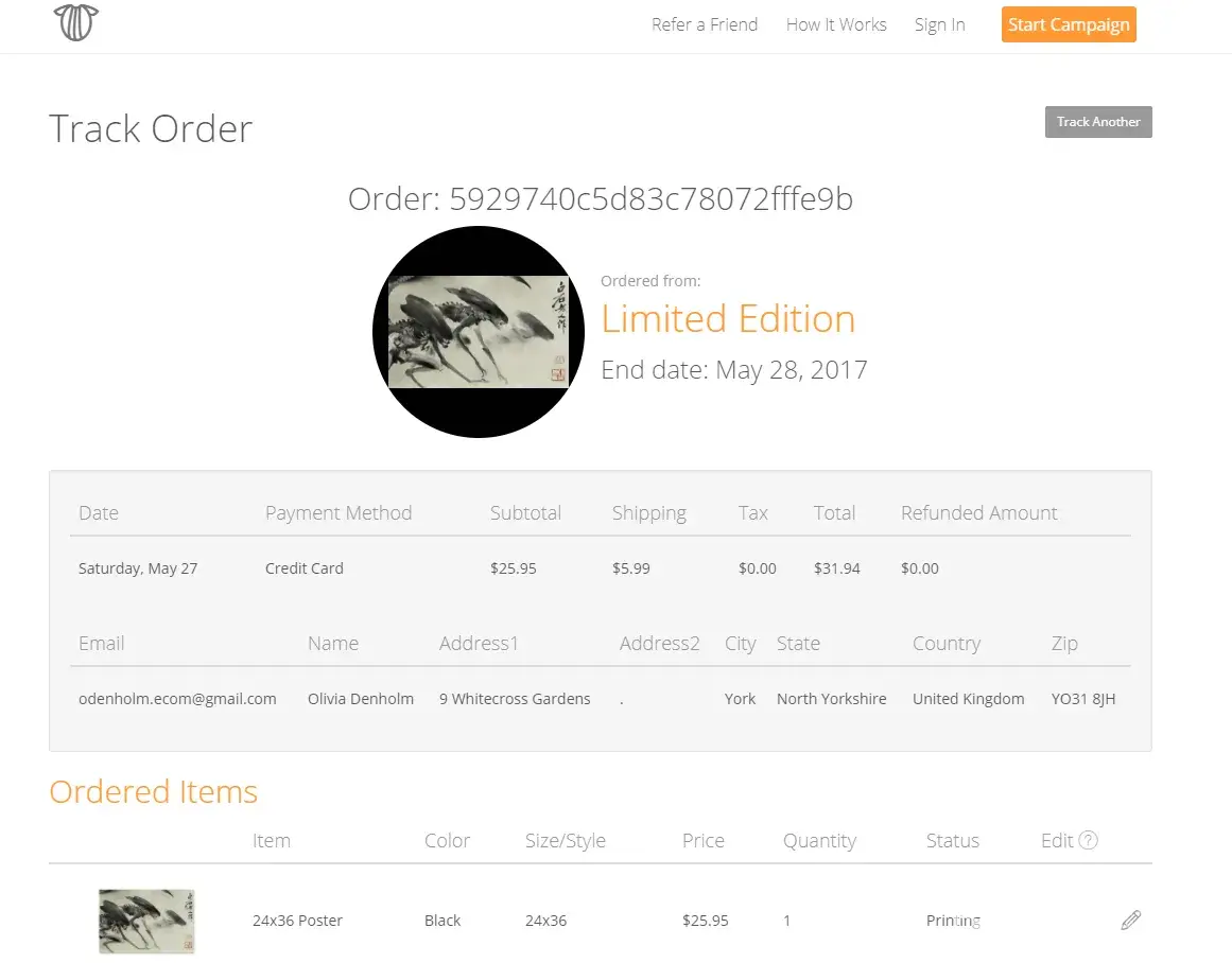 I ordered a T-shirt from them after having their ad in my Facebook feed for weeks. They said it would not ship until the "campaign" ended. The end date given in the email was the same date of the email, May 25. I was told the shirt would ship between June 1 and June 4. The next thing I heard was late night June 8 when I received an email claiming I'd received the T-shirt and providing a link to do that. I gave the company and shirt one star because I couldn't do less. I said that I never received the shirt. I doubt that they really post the reviews as the company has multiple websites and names. The next morning I checked the order's tracking number that I had been given. It was a fake. Then I went to their website where I had to fill out a complaint "form." This form autogenerated a response two minutes later saying that I couldn't get a refund because I had already received the shirt. They claimed that it was delivered to my mailbox the exact same time it allegedly left the factory--wherever that is. How does that happen? I asked multiple times for a refund and they refused each time. I have reported them to my state attorney general, BBB and FTC. I have also asked Facebook to stop their ads. Fortunately, I am only out $30.94. I have also reported them to my credit card company.