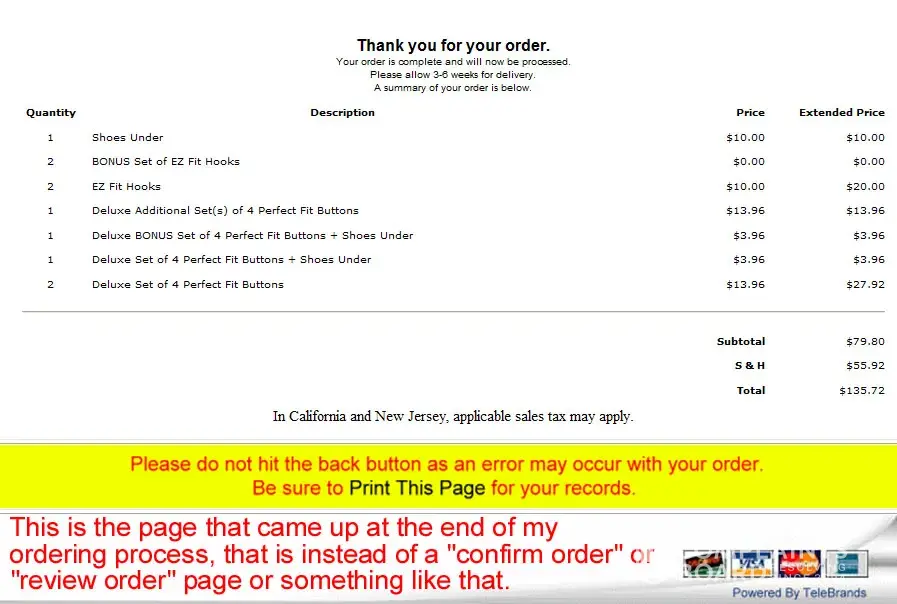 THIS IS THE SECOND SCAM ASPECT OF THE TELEBRANDS WAY OF DOING BUSINESS, NOT HAVING A "REVIEW AND APPROVE YOUR ORDER" PAGE. 99.9% of businesses have a confirm order or approve order page, but not Telebrands.