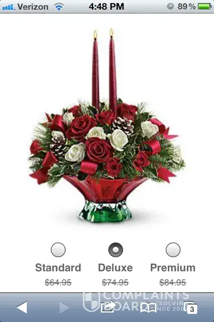 We ordered flowers from Teleflora.com for my mother for Christmas. The product was made by Stewart Flower Shop and delivered. The product we ordered was $90. The product delivered would have fit in a soup bowl. The flowers we ordered were supposed to be red and white ROSES. The crap they delivered was mums and carnations. It was 1/3 the size we expected.