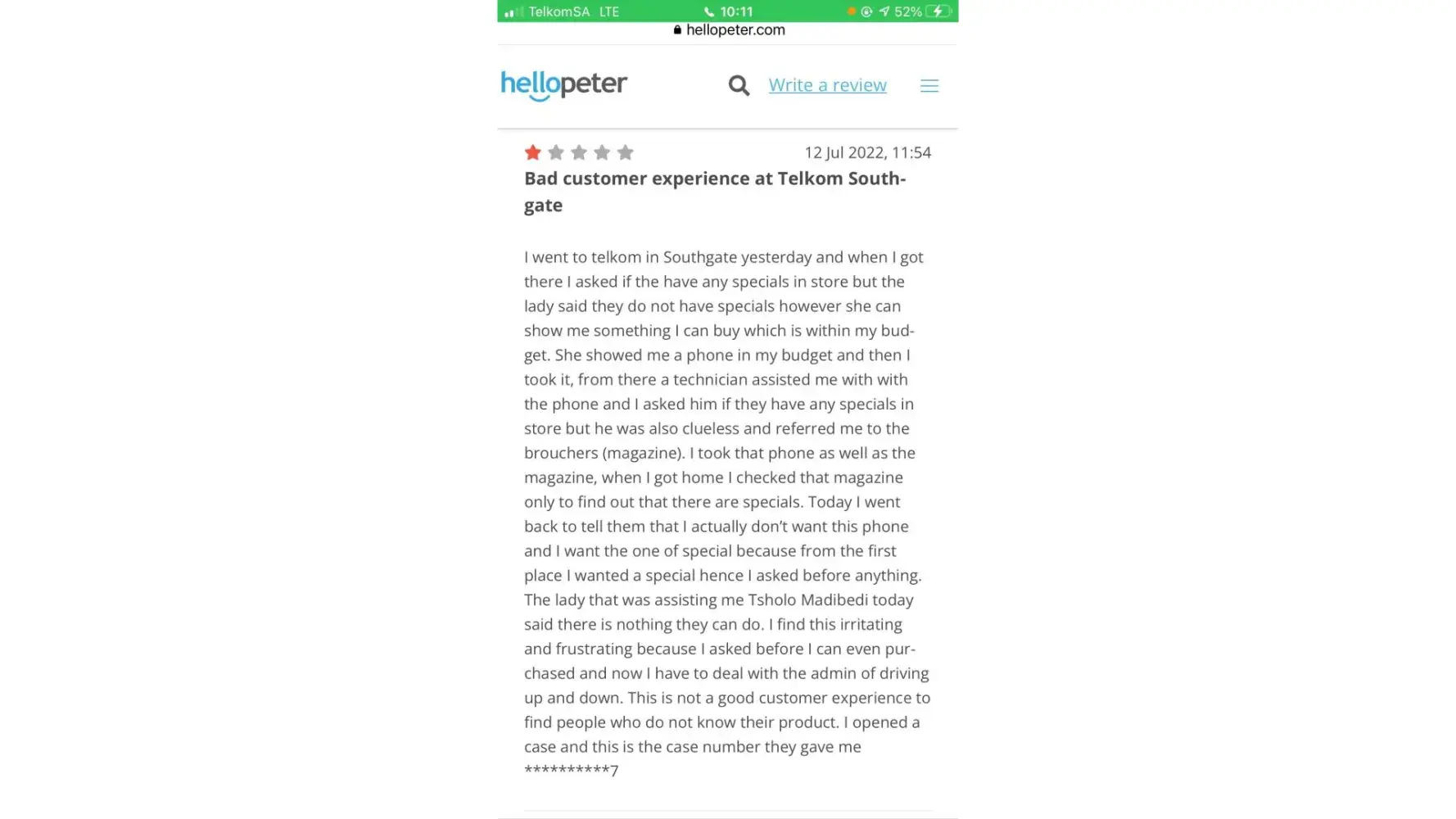 I came in your store looking to buy a phone specifically I advised your consultant that I want to buy something on special as I always prefer to buy phones on special, and I asked your consultant more than three time which phone is on special and I even specified that I’M LOOKING FOR HUAWEI as im looking for phone which uses two simcards. THE only thing your consultant did was to ask me of my Budget and she only showed me your normal broachers which has all phones and I even told that those are normal prices.