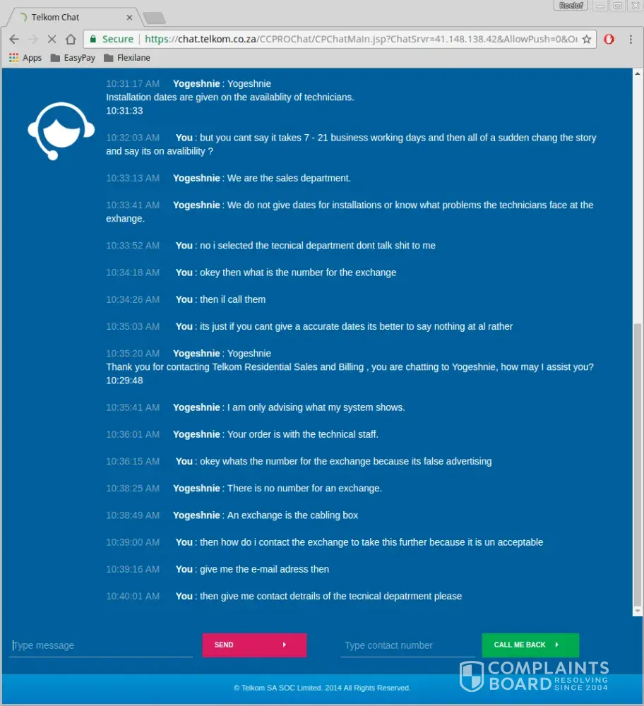 I ordered a line to be put in. They told met its going to take 7 - 21 working days. I then paid the R700 "Deposit" as the guy in the store called it. Only after i payed they tell me its going to take longer i payed the deposit on the 22 February 2017 the next day they send me an SMS saying my line will only be installed on the 6 April 2017, that is 28 working days. When i tried to contact Telkom with my Question on why it is taking so long i don`t get anything. On the contrary when i start asking they just disconnect the chat after i have waited a long time to get someone. Thy easily tell met to call the call center even if they know it takes forever to get someone on the other end in the call center. I screen shot the conversation. find attached.