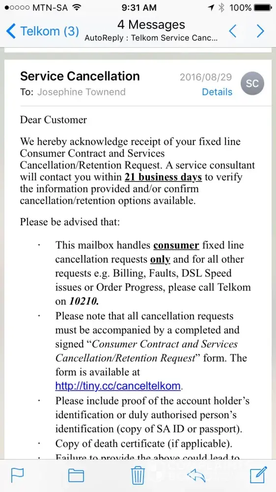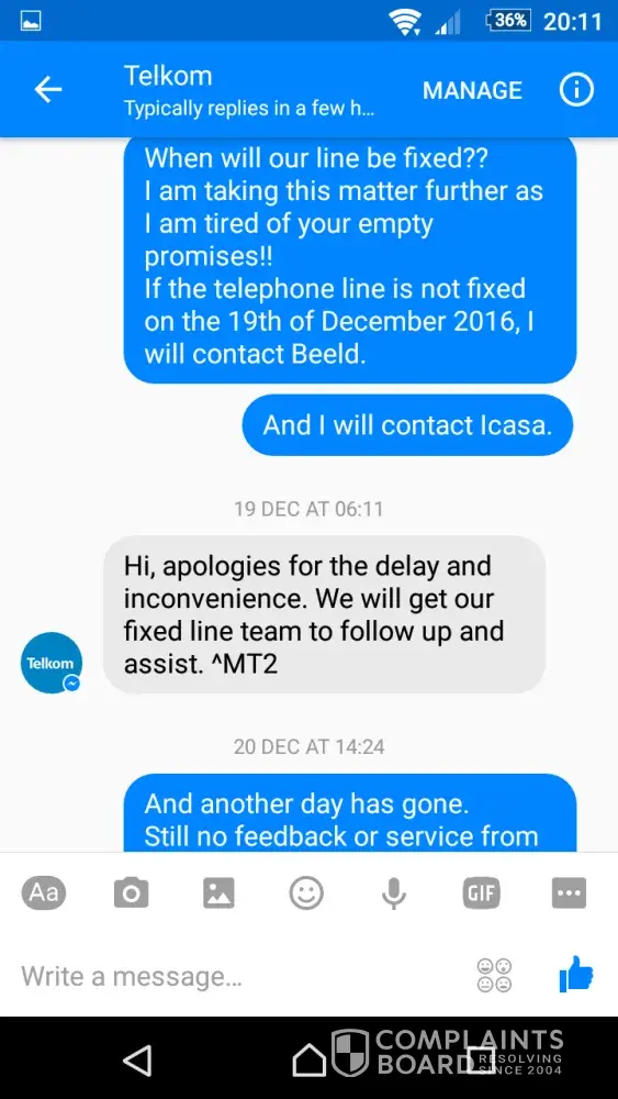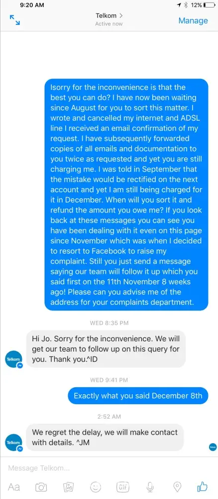 There are a large number of the exact same type of complaint online, without any response from Telkom.