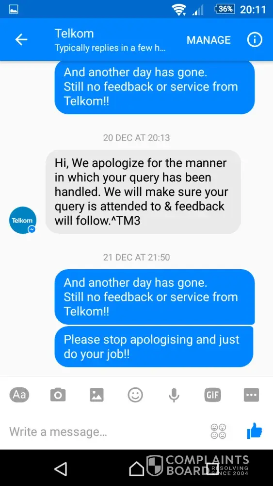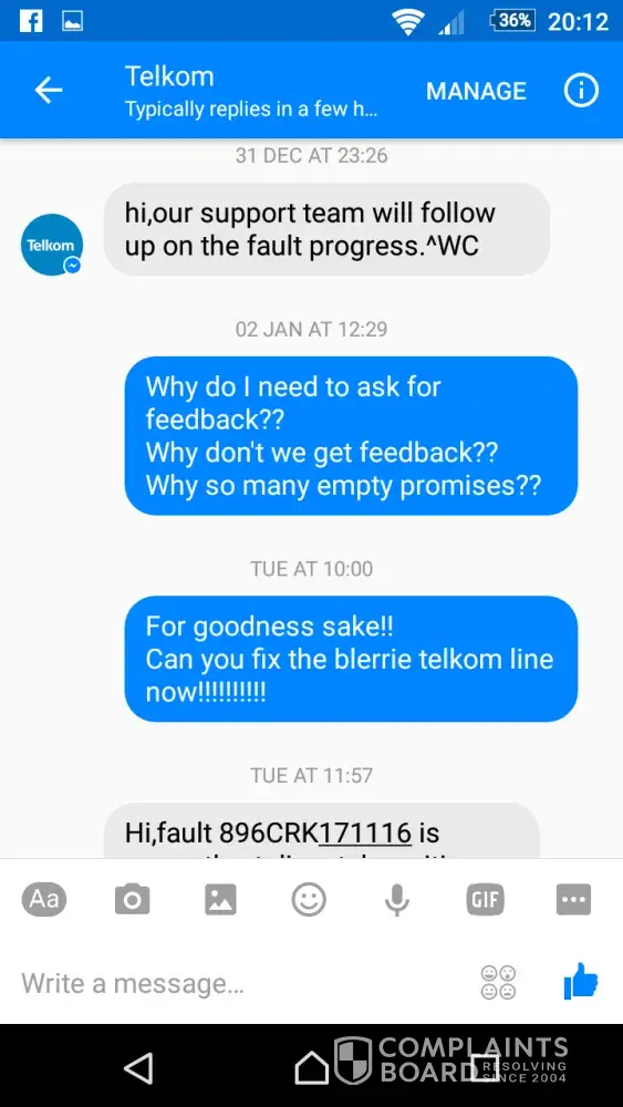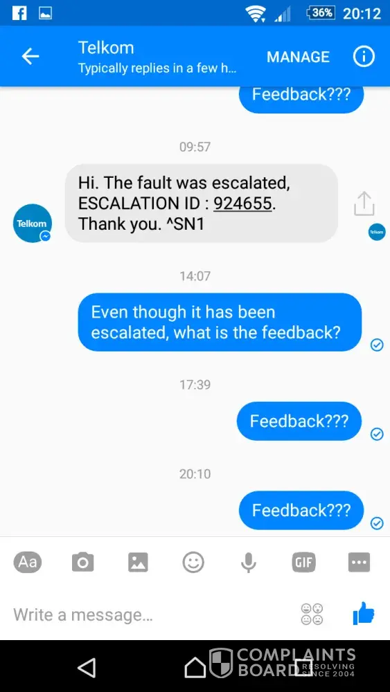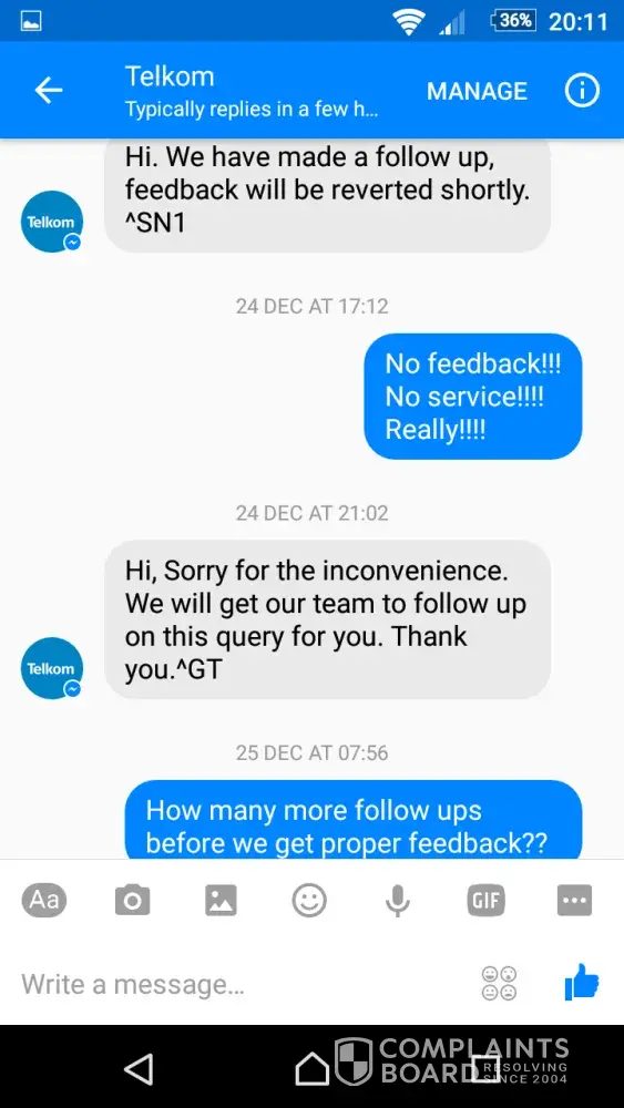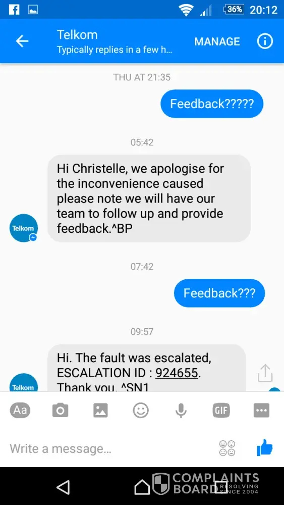 Everytime we follow up with Telkom, we are advised that they give feedback. We never get feedback and they will have the same excuse everyday.