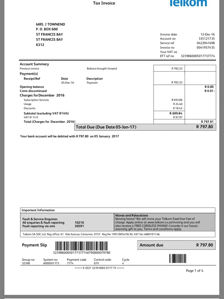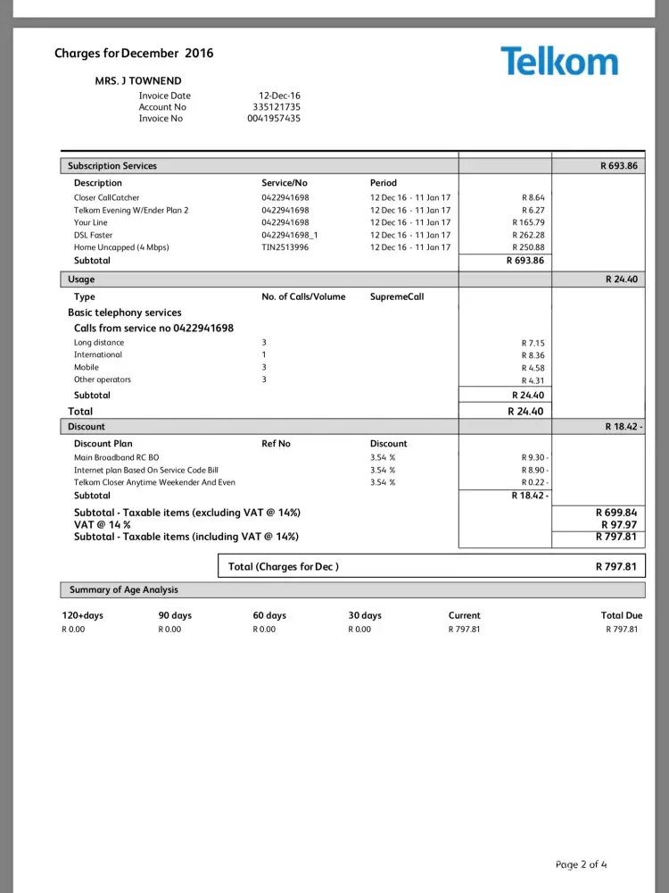 By November I received an sms telling me to make a payment of 574.00 to Telkom to avoid network irritation. It was towards end of November and a week after was 2nd December I received another sms telling me to make a payment of 1458.00!