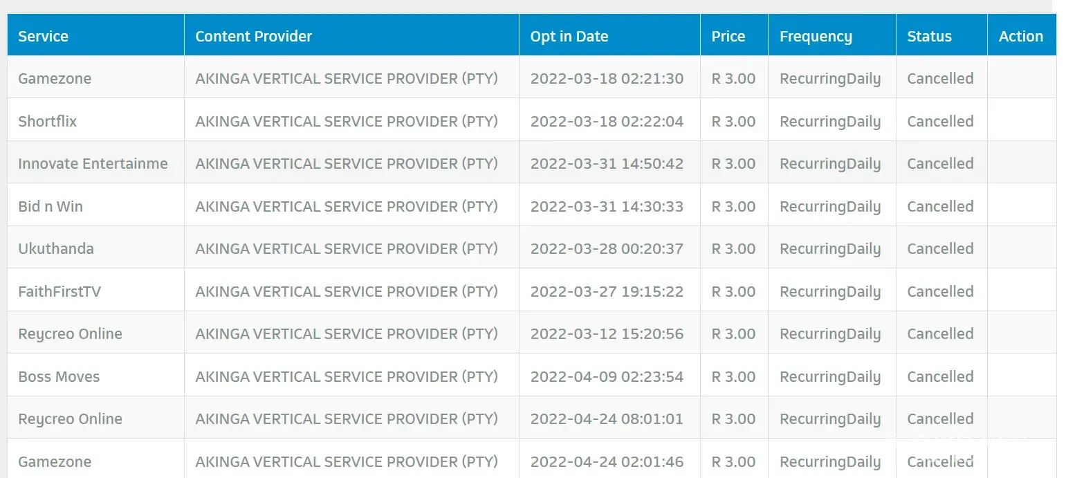 Reycreo Online AKINGA VERTICAL SERVICE PROVIDER (PTY) [protected]:01:01 R 3.00 RecurringDaily Cancelled