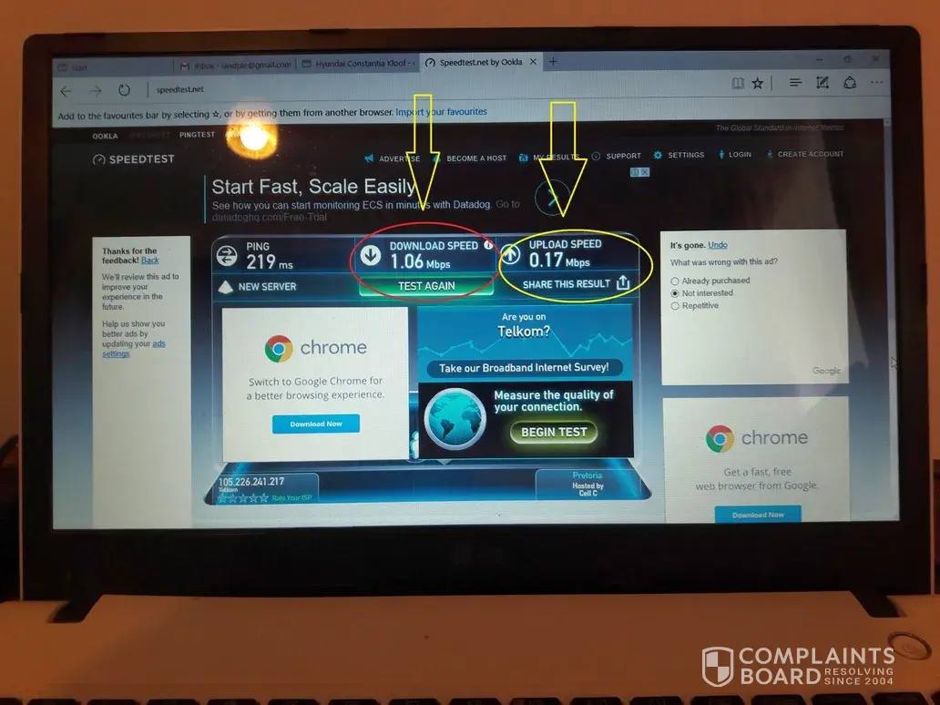 I have now called and called and called Telkom, numerous times. Each time they reset a port. I pay for a 10Mbit/sec service, however i receive if i'm such 4-6Mbit/sec. I am so sick and tired of begging this company to just provide the service that I am paying for.
