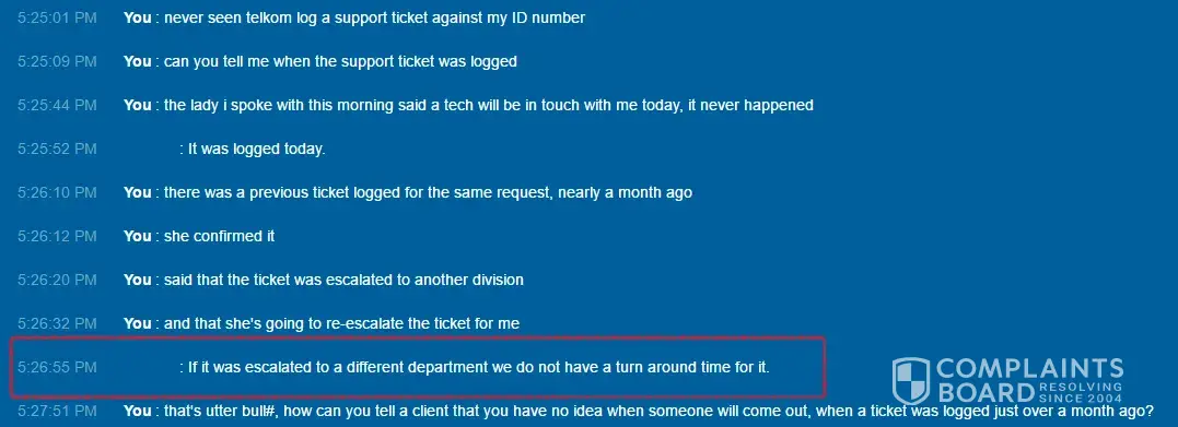 When I phoned this morning, nearly a month after my first submission, I got told that the ticket was escalated to another division and it's out of the mobile divisions hands (a service supplied by the mobile division), but it will be escalated and a tech will be in touch today. Just after 17:00 I had not heard anything and tried Telkom again, only to be told that they cannot give me an indication of when this will be escalated.
