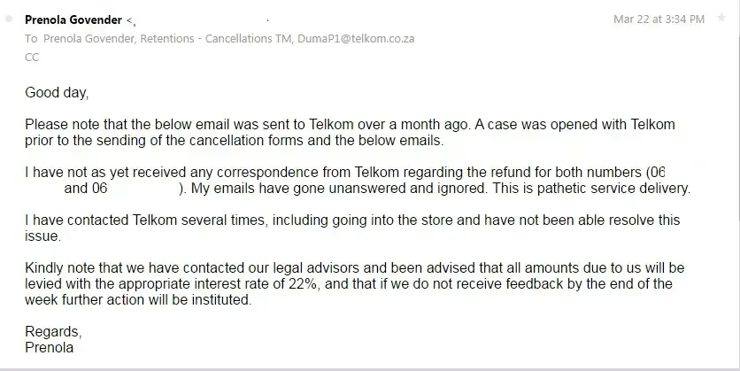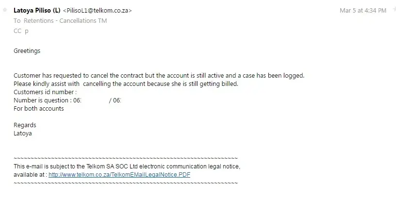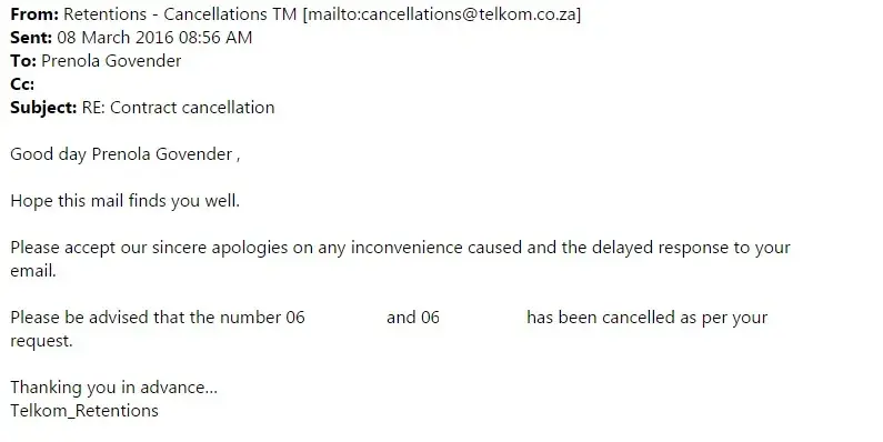 Telkom had confirmed at the beginning of March that the contracts were cancelled, but still continued to bill us for the period 09 March - 31 March.