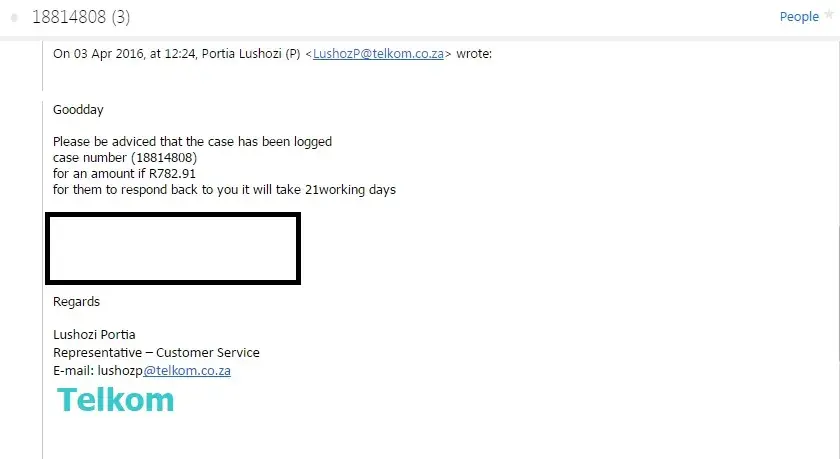 On 1 april I contacted telkom and explained the situation. I was told to e mail all the relevant documentation inclusive of a id copy to [protected]@telkom.Co. Za which I did.