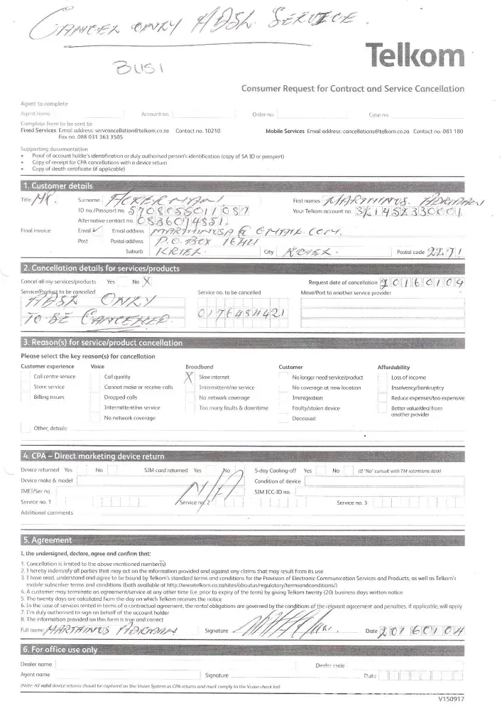 Account [protected] Request for cancellation was send end of December 2015 on the Consumer Request for Contract and Service Cancellation form. This was send to Telkom Service cancellation with my ID as I am the accountholder of the account however no response received up to now. I send emails to the Service cancellatio Department but only automation replays received each time I follow up.