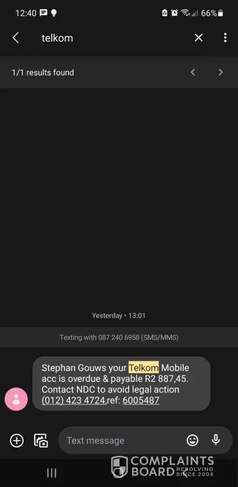 23 Nov 2021 I received this SMS (SMS attachment) and I am being threatened with legal action.