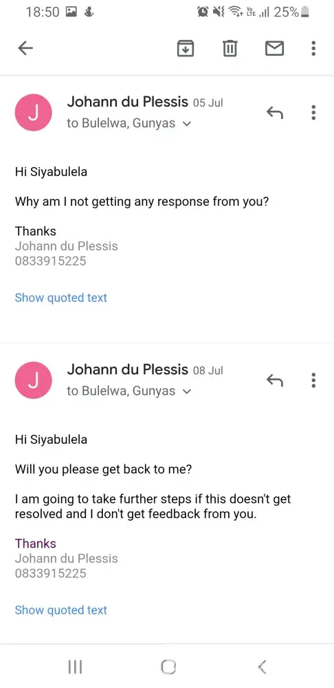I would like to confirm if you received my below email and whether you would be able to assist me or should I receive your silence as a response and start taking steps against Telkom after today?