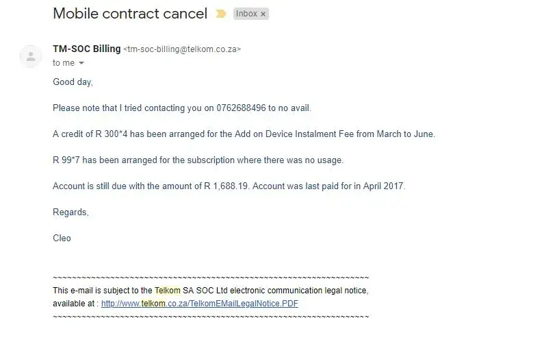 I had upgraded my cell contract with telkom on the 26 March 2019, the salesperson didn't inform us of the full subscription fee that we need to pay for 5 days of R700, and now my bill was double, I called telkom customer service, I have the manager n the customer service names but was helpful. Telkom needs to hire more competent staff or train them, insist for my conversation with then to be heard as to how they treat clients . I'm very disappointed with telkom, n wish my contract be cancelled . Chantal reddy [protected]