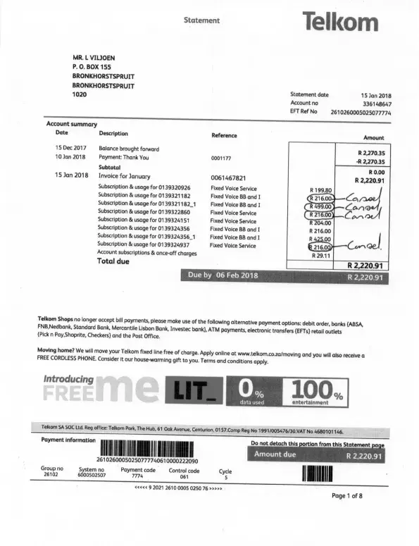 I have reversed every single debit order because I do not use my Telkom services. I have cancelled them. I refuse to deal with this system any longer.