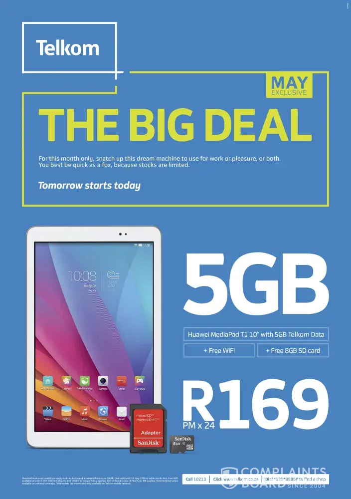 I had signed a contract in 2016 for 5 gigs of data and a huawei tablet for r169 per month. The last few months my data had just disappeared. This month I saw I can only get 500 mega bites which I didn't even received. I called the call centre that could only logged a call after 45 minutes. I went to Telkom [protected]@reds and the lady couldn't help me at all. The more I said I had signed a contract for 5 gigs, the more she said I am on a contract for 500 mega bites. She doesn't want to listen and she was totally unable to help me. This month I didn't receive any data!