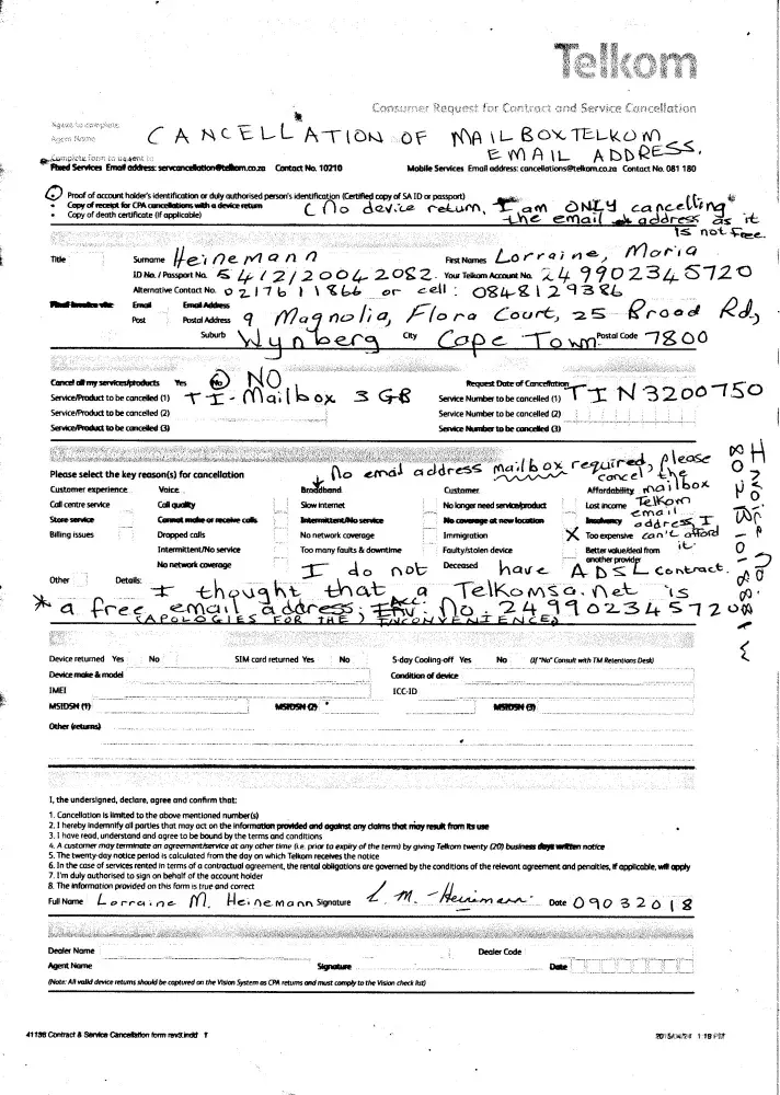 Please note that I am ONLY cancelling the EMAIL address, do NOT cancel my other products and services with Telkom Mobile.