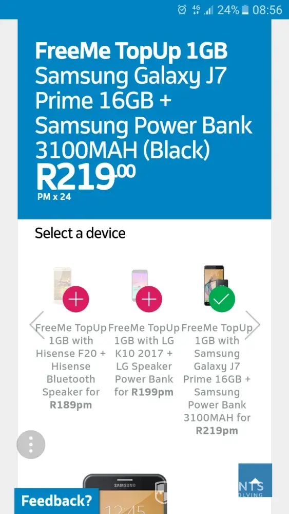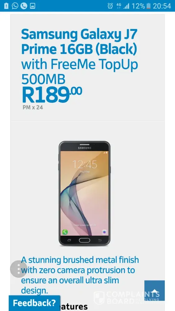 The phone was a present for my sister on her birthday. I sent the phone to her in Cape Town. When she received the phone she notified me that she only got 300mb. (I then thought it was only because the phone was not received from the start of the month they only gave some of the data and will then only bill us for a certain amount of data, as they did the same with my contract phone.) Then on the 1st of December she told me she had only received 500mb data and not 1Gig. I immediately phoned Telkom to ask what was going on. The lady at the call centre then told me that there is no 1Gig top up with the j7 Prime available and the contract is for 500mb there is only a 1Gig open contract available on the J7 Prime. I told her that there is a 1Gig Top Up with a J7 Prime and I have the proof from their Leaflet as well as a screenshot from their website. She then said I have to go back to the store where I received the phone so that they can rectify it.