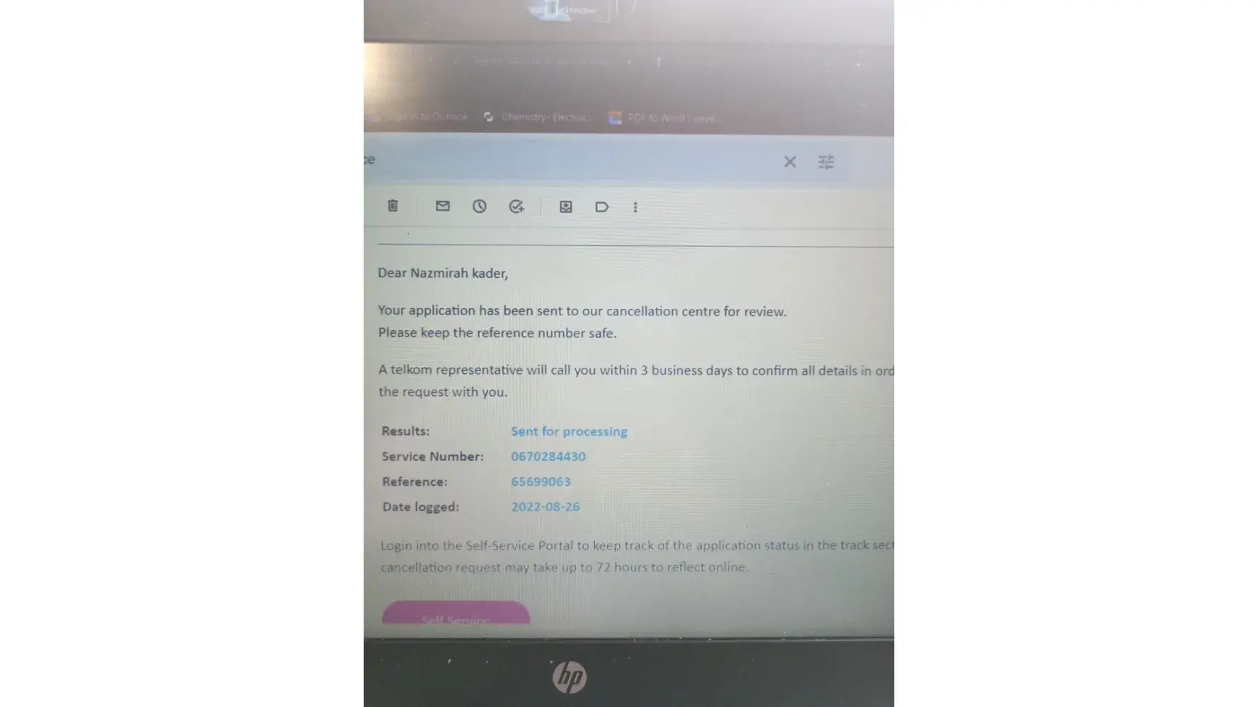 Hi I paid up my telkom account and for the second time now when I call I've been told they logging my quiry for the letter but still u have no response. Can I be please assisted as I need letter urgently. The following is my reference: