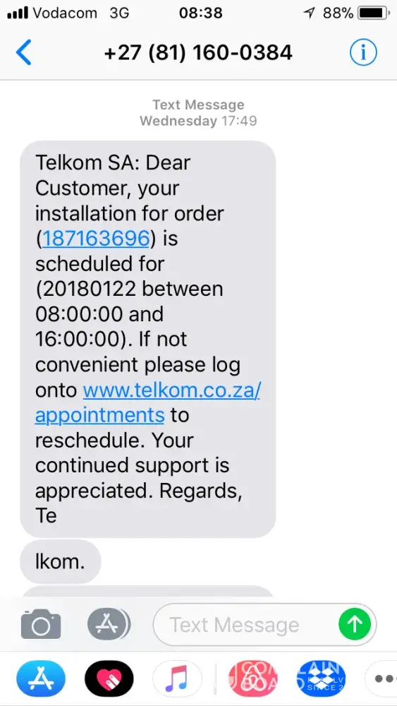 On the 06th December, I received an sms from Openserve that an all-day appointment has been scheduled for their representative on the 08th December.