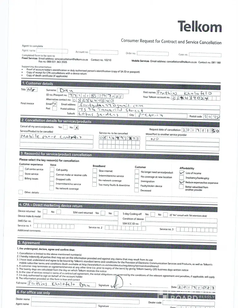 In September 2017 I sent a form to the Telkom service cancellations department informing them I wished to cancel my ADSL service as of 30 November 2017 as I was moving to New Zealand.