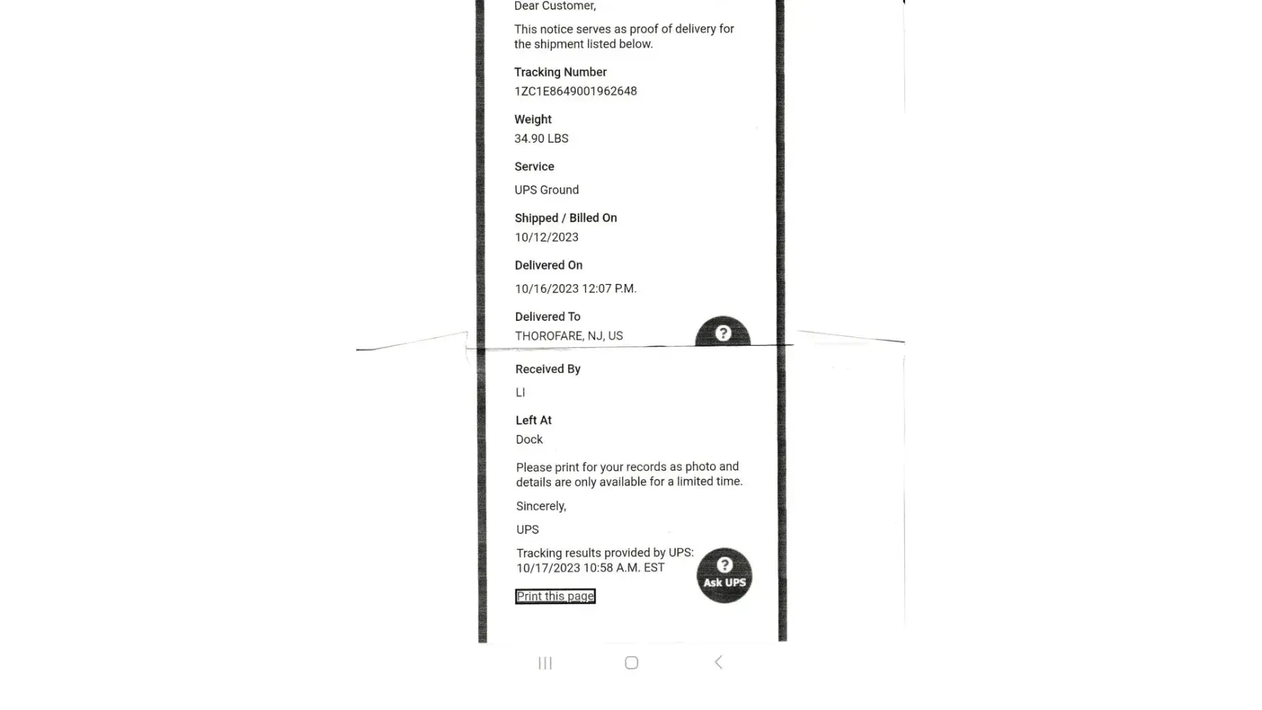 Refund not recieved. UPS Tracking #1zc6k335yw30573451