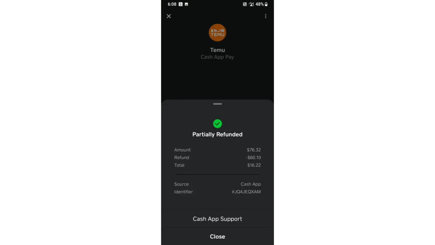 However, Cash App says that I recieved a "partial payment" of $16.22 with a balance of $60 still remaining.