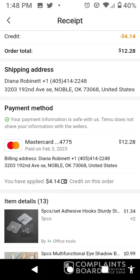 Your order has been canceled. We have not deducted money for this order. This order was placed on Dec 27 with Mastercard...0162 ($157.02) and Temu credit balance ($3.69). View order payment details