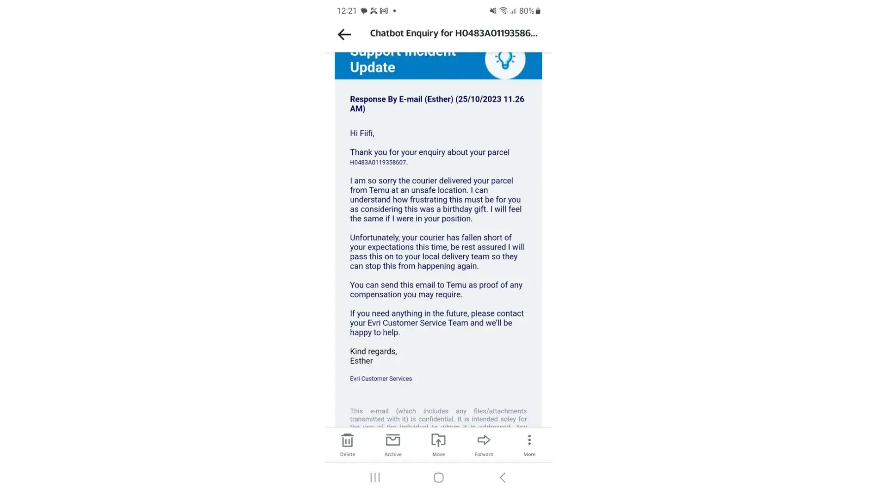 I received a message saying that part of my order was delivered at 10-45. I have not had a delivery at all and have been in all day. I have purchased countless items from you but every thing previously has arrived. Please find out what is going on.