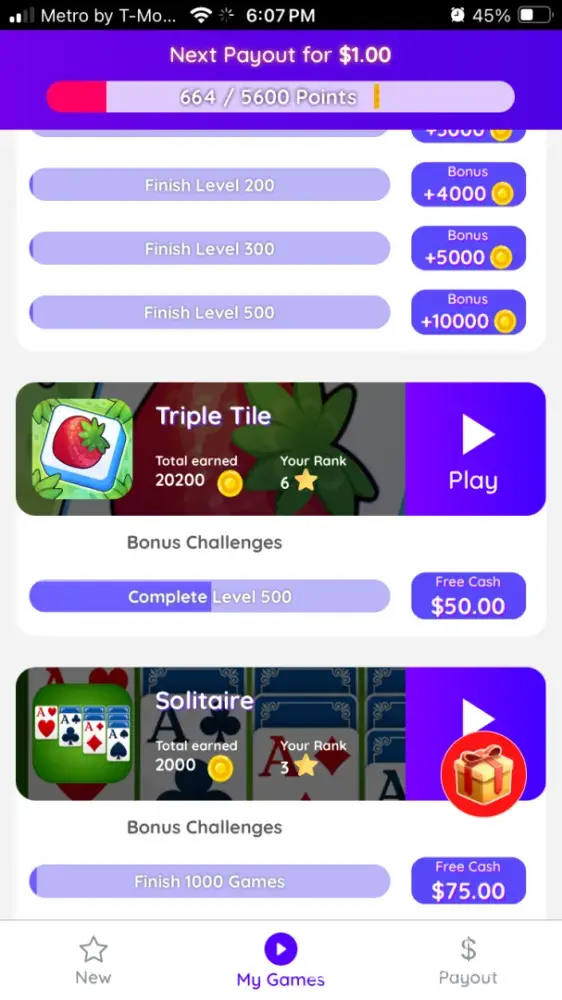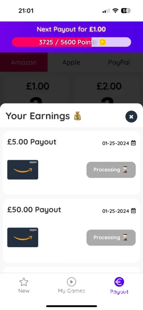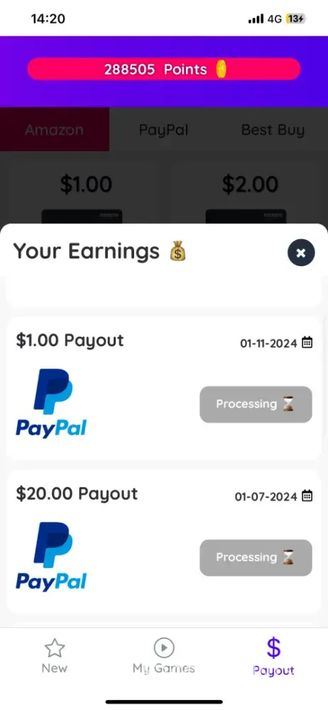 Ok, first the positive- This is a cute little app and the many of the game characters and app graphics are adorable (ironically the cute little star emoji with the heart glasses is what persuaded me to leave a review lol). I made 4 dollars within a couple days and cashed out via Amazon gift and my payment arrived in less than 10 minutes (honestly the fast payout is the best thing about this app, I’m my opinion). However if you download this app you’ll have to use several apps to even get a few dollars if you don’t want to spend any money on upgrades/prizes in the game. One example of this is the Dice Dreams game where you make the equivalent of 1 dollar after advancing to Level 5 and there’s an “offer†on this app’s homepage to get 3 dollars for spending money in the Dice Dreams app. Like I said, if you’re ok doing that then that’s fine but otherwise, no offense, I’m personally disappointed with this one.