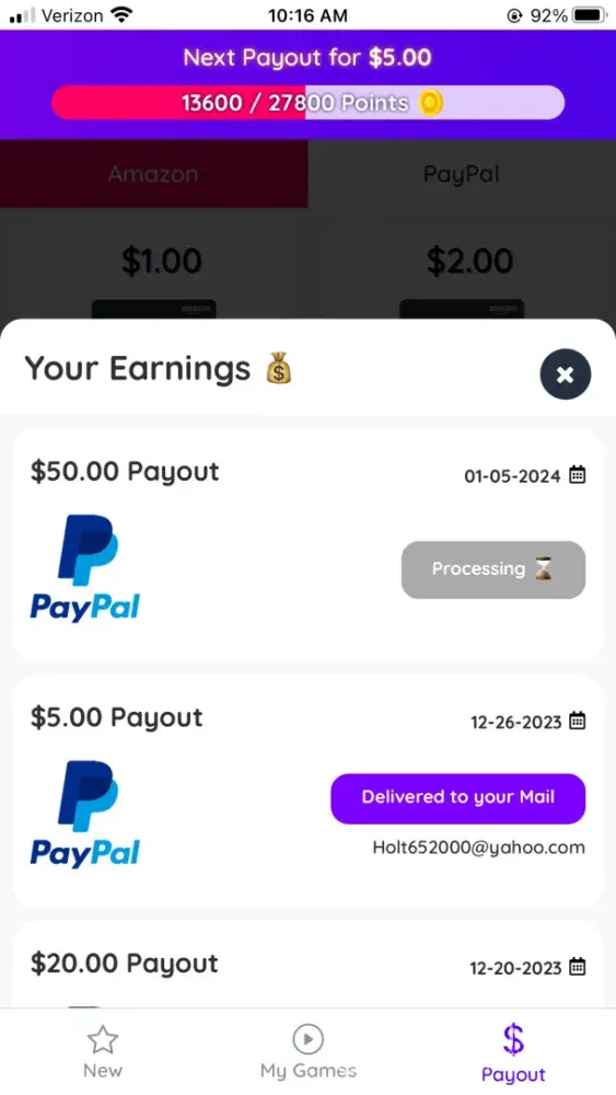 Unlike android where you have Just Play, Just Rewards, Mist Play, ect., IPhone doesn’t off many of those choices. So when this was recommended in my App Store I was all for it, The games are great in fact I am having a good time playing a few of them. My first bout of frustration though, came when I was just a few thousand coins from being able to Cash Out $20, the app updates and they raised the amount of coins you need to acquire to cash out. But oh well I could deal with that.. What has me super frustrated right now though, is I needed to pull some money together so I decided not to wait for the $20 and to cash out $10 Tuesday afternoon, I get a notification in app pending, than another another one saying it had been transferred. I have checked my PayPal several times and the funds still weren’t available. I reached out to support and still no response. I tried cashing out for $2 and still nada. I’m unimpressed with the app at the moment, as well as their customer service. If funds make it into my PayPal I will change my rating but until something happens and I’m compensated for my time in app I will no modi’s