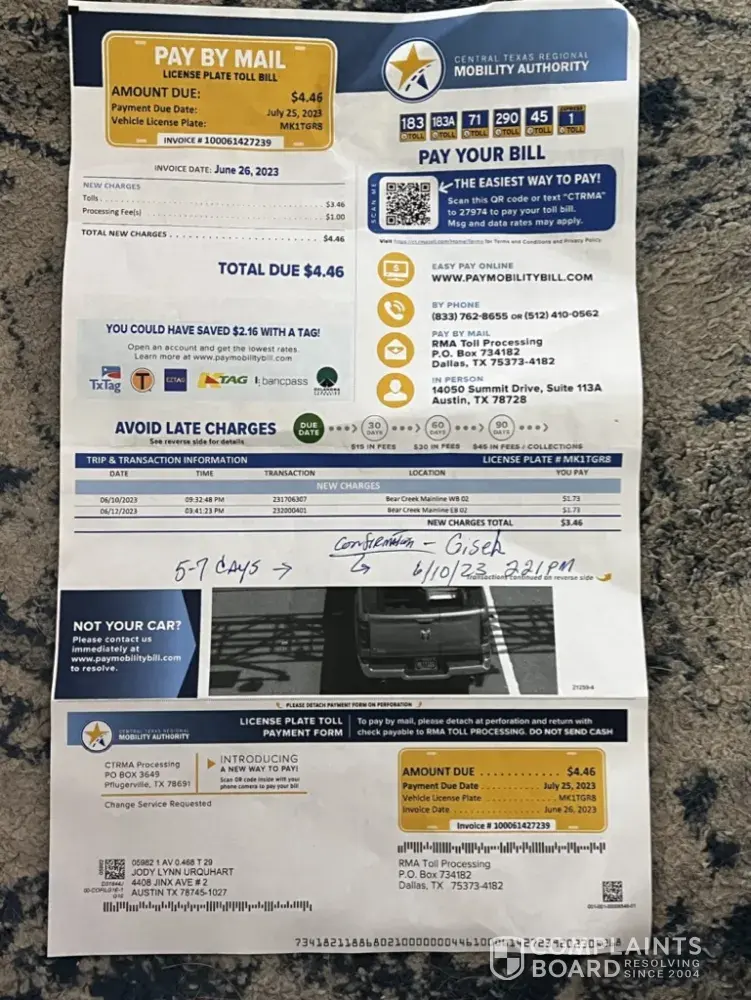 For the past couple of years I have been receiving total bills that do not apply to me. I have called on this and each time the charge is deleted, I'm given a dispute number, and told I would receive a resolution letter in the mail with 7 to 10 business days. The last dispute number was in June 2023 and at that time I was advised the my license plate would be removed from the system to keep this problem from continuing. However...here we go again...I have received another bill with a due date in October. my vehicle is a little beat up 96 GMC FARM TRUCK that has ONLY traveled to livestock sell barns in McLennan, Bosque, and Coryell counties! This vehicle is FARM use. PLEASE, PLEASE...remove license plate AR87993 from your total system! It is a waste of