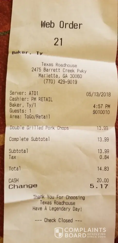 On Sun, May 13th I visited a Texas Roadhouse location for the first time at 2475 Barrett Creek Pkwy, Marietta, Ga. I had placed on order online for pick up at 5pm. I arrived 10 mins earlier paid for my order and waited for my food. A woman came out and told me they dropped my food and were in the process of remaking my food. She gave me a discount off my meal and refunded $5 and some change to me. My total was originally $14.83. I waited in the car and someone brought out what was supposed to be my order, but it wasn't. It was a hamburger, when I ordered Grilled Pork Chops. I took it back inside. I went back and waited in the car after a few mins someone brought out my order, but it still wasn't completely right. The mixed vegetables were missing from my order. Finally at 5:25p I had my complete order and left the restaurant. I have no complaints with the taste of my food; however I do have a problem with the service. Due to all the issues incurred with my order I feel it should have ended up being free not just discounted.