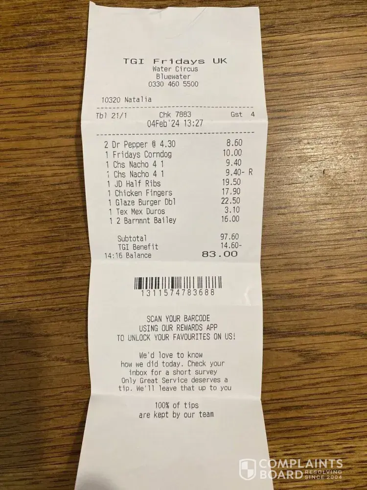 Me and my wife decided to go to TGI for an evening meal out the food and service was very very good until we received the receipt I have a blue light card which gives me 20% off at your restaurants so I was a bit disappointed when I received my first bill which had my discount but at the very bottom the server had put a £10 service charge onto my bill null and voiding my 20% all together