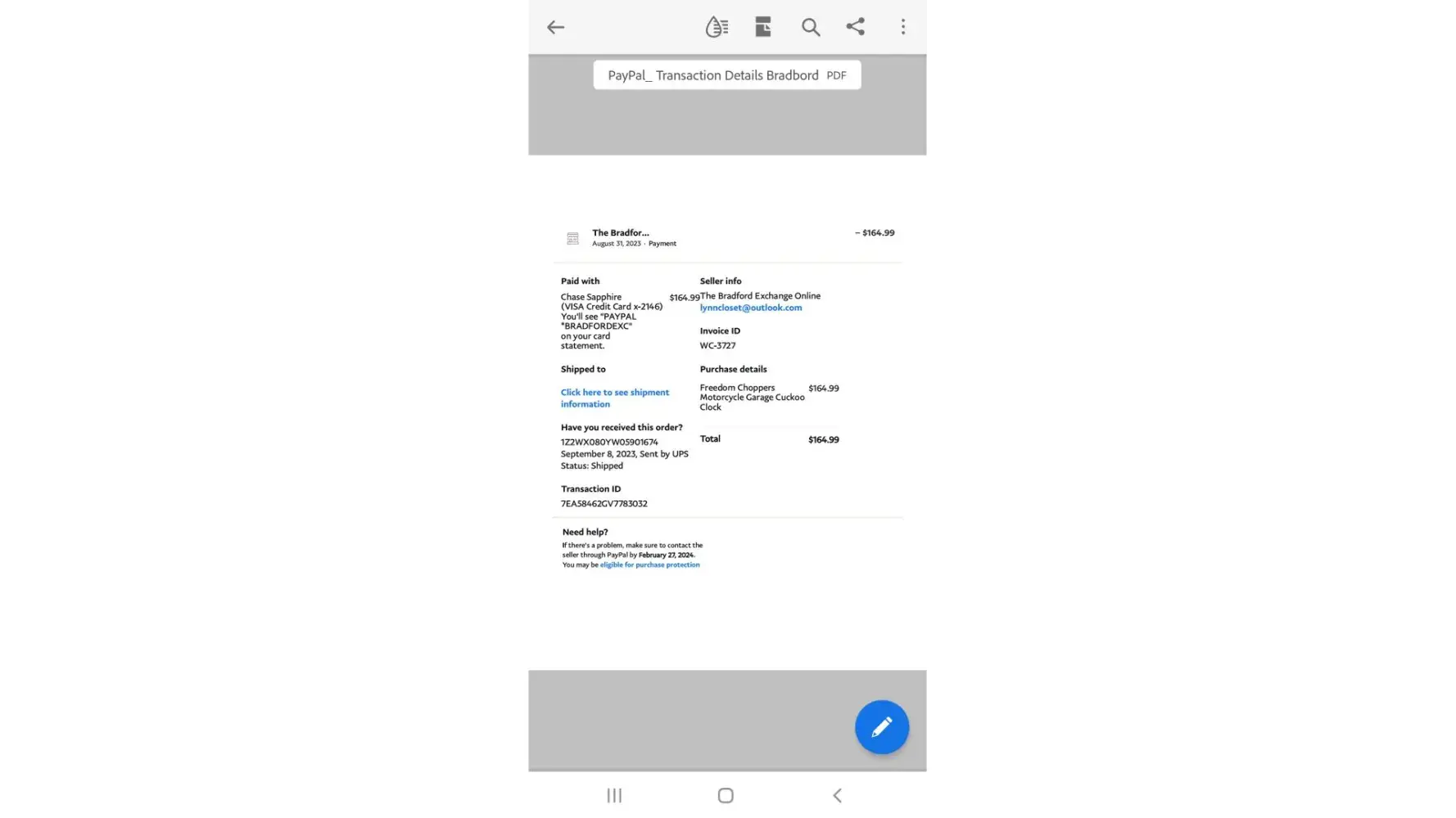 I ordered a Freedom Chopper Cuckoo Clock in September 2023 from the Bradford Exchange online for $165.00, paid for it through my PayPal account, it was delivered to me in October 2023 . The package had another persons name above my address, no problem. After contacting customer service they informed me that my credit card declined the charge. I asked them for the last four digits of the card and I informed them it was not mine. Then they assigned my name to the persons account whose name was on my package and they demanded $271.00 for the clock. After sending my PAYPAL transaction and a copy of my credit card statement showing the Bradford Exchange transaction they still refuse to acknowledge my purchase.Now November 2023 the clock stopped working I contacted customer service , they sent me a return label I shipped the clock back, now they informed me they will not replace my defective product unless I pay them, the Bradford Exchange is a fraud company to deal with.