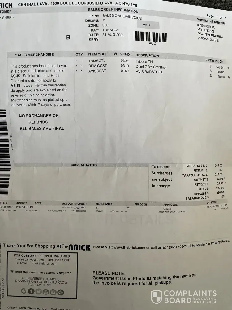 Hopefully you can fix this. I will never shop at the Brick again