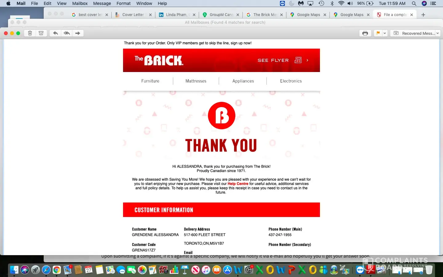 after many attempts to communicate with local store manager, I have to write email to the Brick corporate customer service department. the below email was one of the email I sent to them in June.