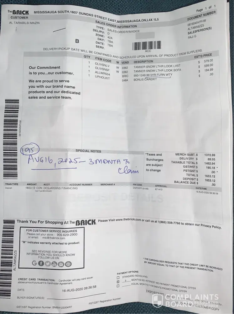 Purchases a mattress March 2019 from the Brick in St. Catharines, Ontario. Was not satisfied with Mattress. Reported Warrant claim, within two months.