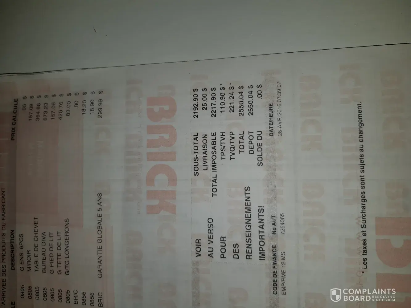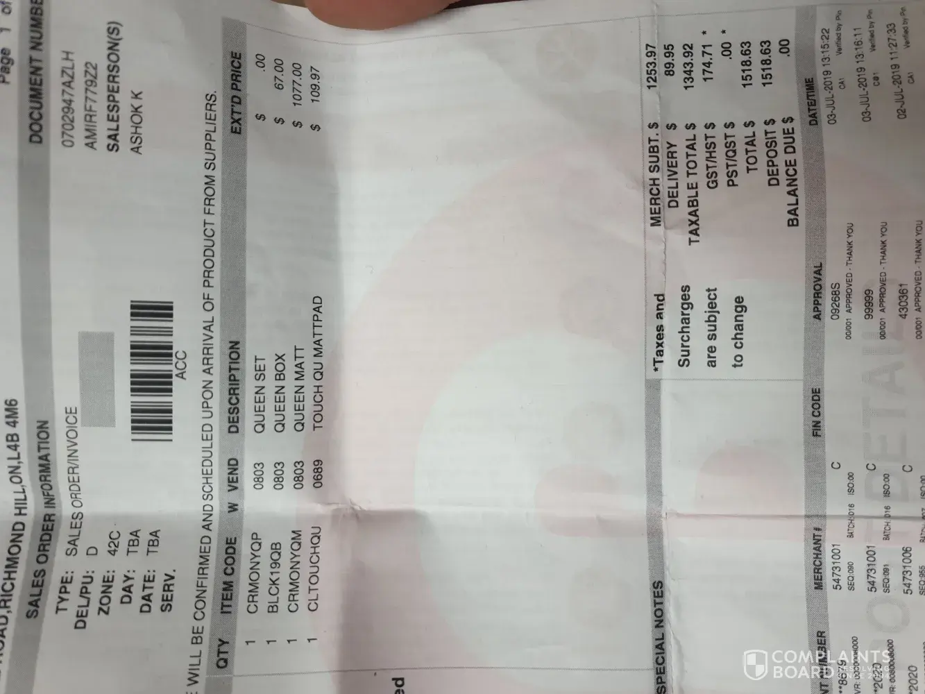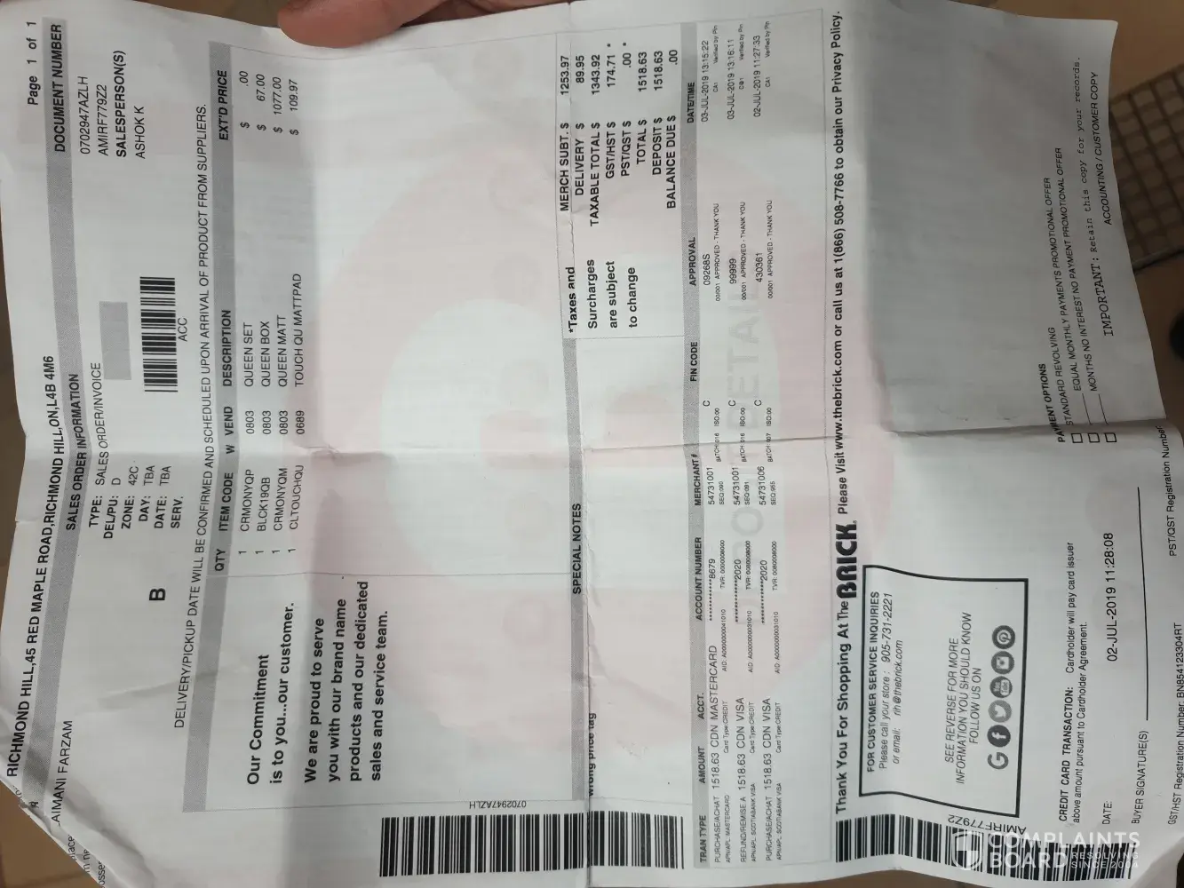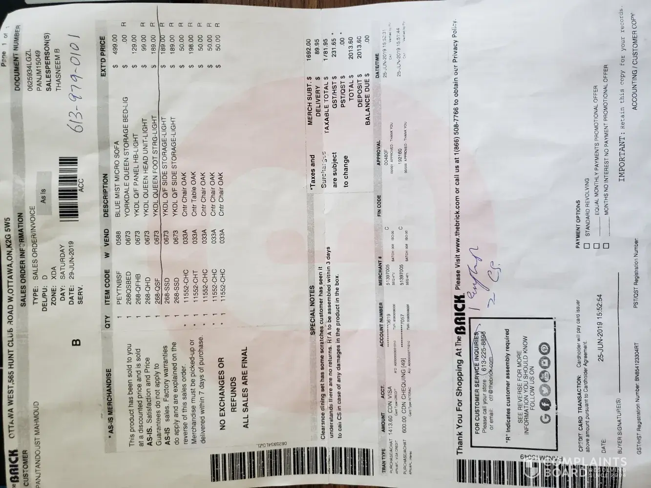 I purchased over $2000 items on June 25th, 2019 from the Brick store located in Ottawa, Hunt Club Rd W, K2G 5W5. They delivered all items after a few days which