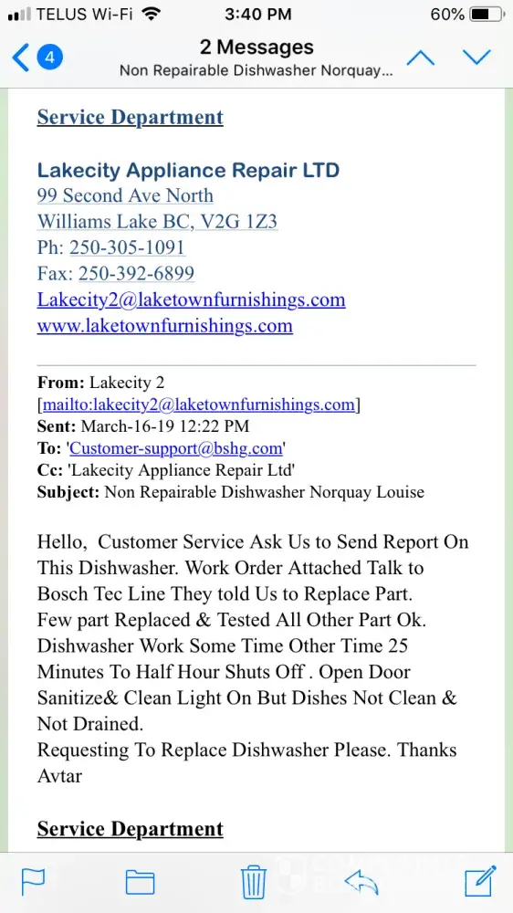 Bosch DIsh Washer purchased June 25/18 had few glitches in beginning but seemed to be just getting used to then the glitches became everyday... would not complete its cycle for possible 3-4 starts we were unavailable for November and part of December so January went into local store they just told us to contact Bosch (not their customer service would do for us!) gave us number in England like excuse me finally got ahold of someone in California who seemed anxious to help gave us name of repair (local) process started now everything except the outside cover and the racks have been replaced and it still cannot complete a dishwashing in one start needs to be switched to another cycle sometimes 5x very annoying and I am in anarea where water is not free I have 1350gals to last 10 days most recently March 11 last repair done and repair sent word saying nothing else they can do the DW is a lemon and should be replaced. When I approached staff at store they indicated it wasn't their problem told me I could not bring back for refund the little miss at counter Courtenay actually told us there was no number for head office that they couldn't even call there was no email or phone number they could give us we feel we have been abandoned and like we have an $850 boat anchor in our kitchen. Thoroughly disappointed in how we have been treated and the "top notch" product we supposedly bought. My name is Louise Norquay my phone number is [protected] or home [protected] at this point I just want someone to call and at least explain why we are not worthy of having answers orbhaving the product replaced... Courtenay is a waist of skin when it comes to customer service however Tristan couldn't be bothered to even call so I'd say the ball is in your court but clearly the Brick doesn't do business with people it just does as much damage as it can then leaves you hanging... not impressed