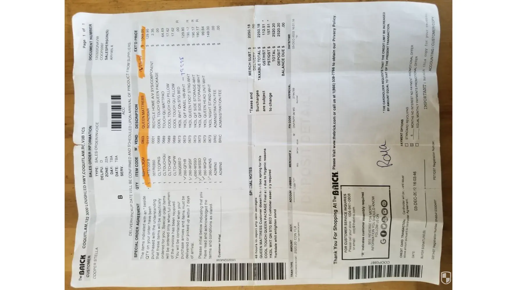 After all of this hassle and after the pick up and delivery was made we followed up with The Brick to confirm the amount of the “refundâ€. They informed us that it was $743. This was obviously well shy of what we felt we were owed ($1,455.95). After factoring in the new mattress purchase of $391.95 less the down payment of $39.19 our refund should have been $1,103.20, The store manager informed us that she had to deduct the “free†gift package (which we never asked for) plus she had to charge us for the second delivery of $75.