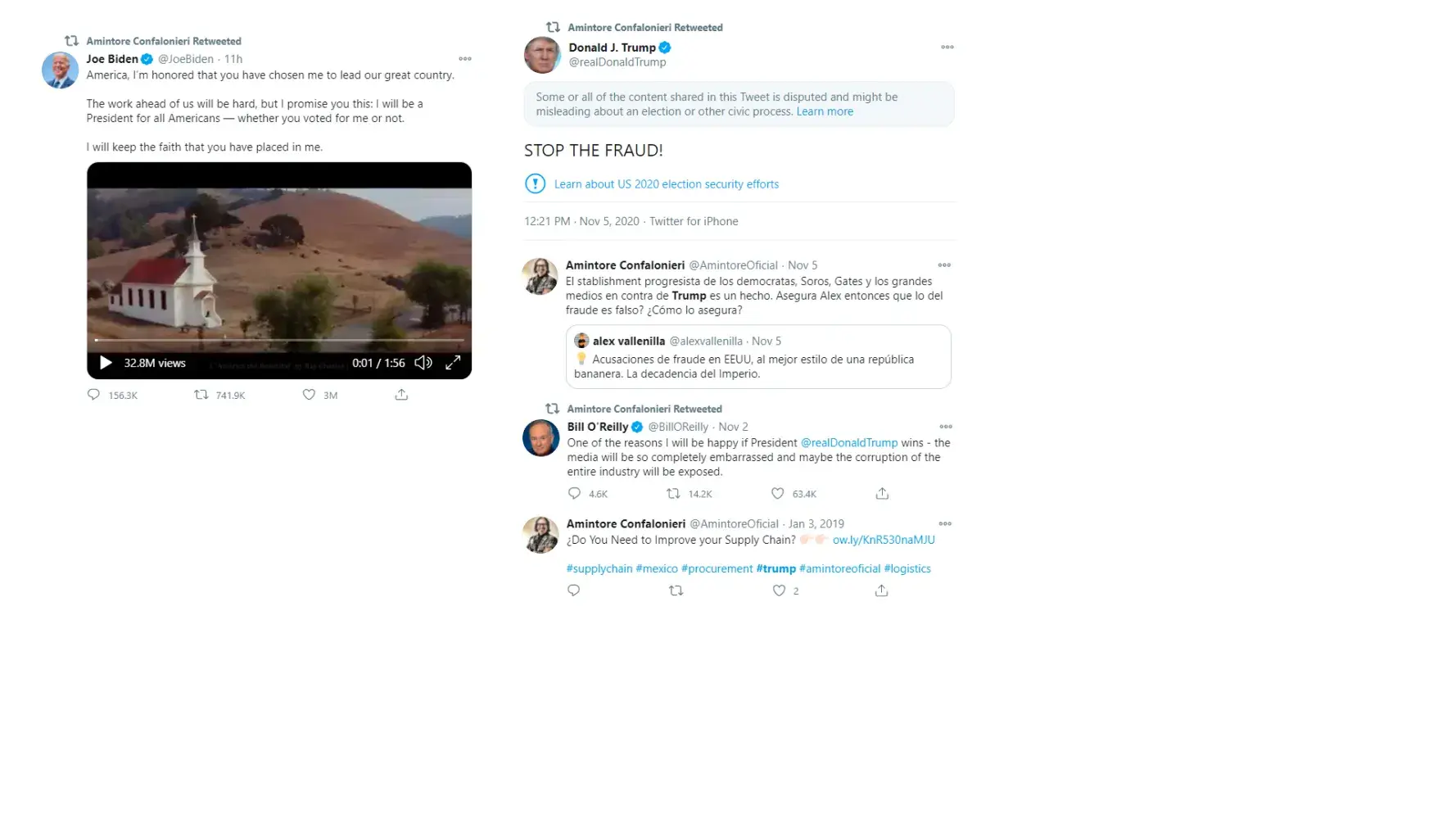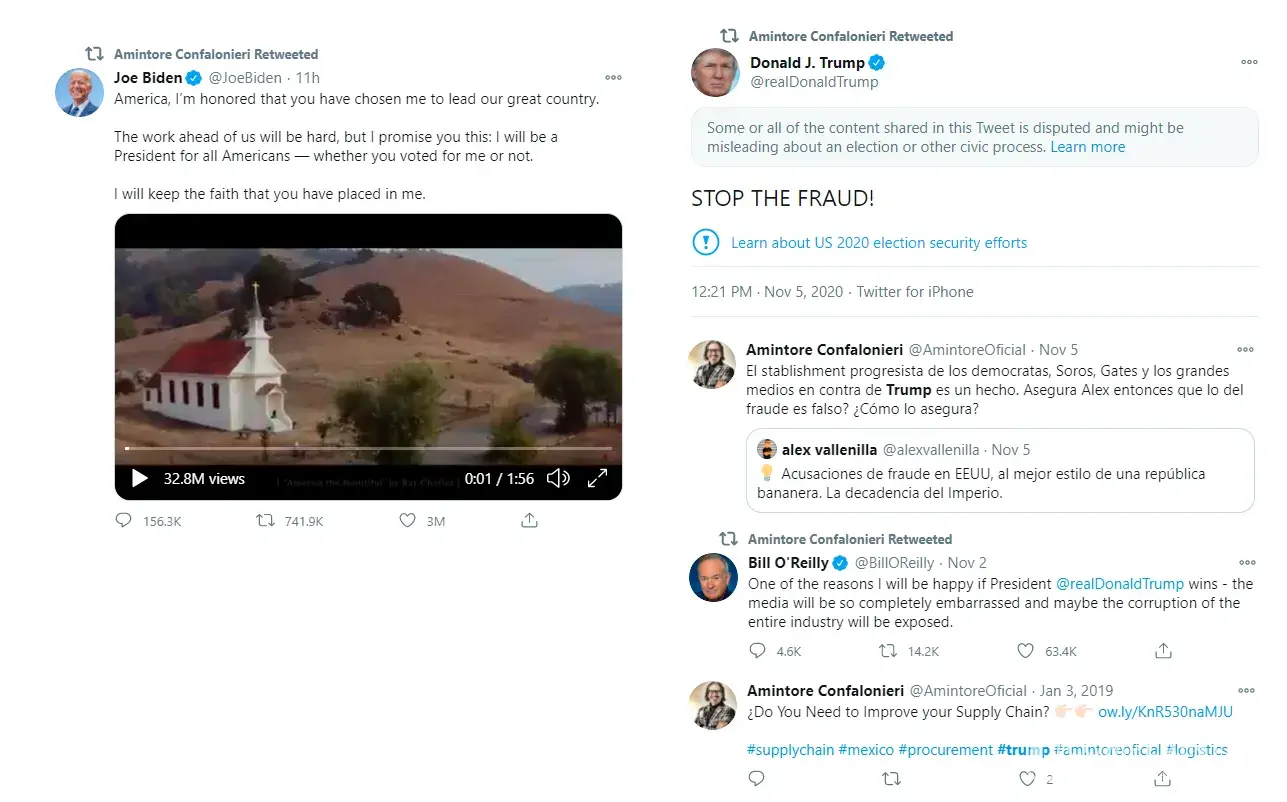I said it on the other page and I say it here again. Amintore Confalonierri is the type of scum that the wall was built for. Abusers, scammers, blackmailers, con artists that try to take advantage of others and manipulate everything around them for their own gain and benefit. On the attached report you'll see how obsessively 'pro-Trump' Confalonieri was even claiming that he was working with Trump's team as some kind of business liaison with Venezuela. Until today, 11/7 when he switched gears to 'pro-Biden'. Not just a swindler but a chameleon that changes colors as needed for his scams.