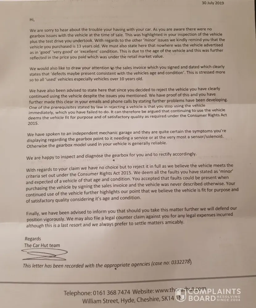 I have emails and telephone call recordings of this garage telling me i have no rights after buying a car for my wife that had a leaking roof, gearbox warning lights, engine rattles and a faulty passenger side window that is stuck in the down position (All within the first 30 days of ownership). I asked to return the vehilce for a refund and was met with avoidance and rudeness, putting the phone down and hiding behind letters telling me they would defend rigorously in court. Zubair, Jay, Alex, whichever alias name you want to use. You should be ashamed of yourselves taking money off a young mother and bot taking accountability! Do not buy a car off this company, you will regret it. If i could upload the calls here i would! Avoid them like the plague. Perhaps this might stimulate a phone call from someone at The Car Hut seeing as they wont talk to me!