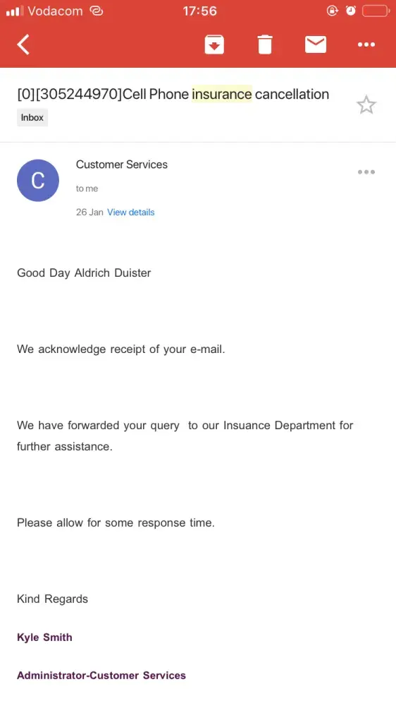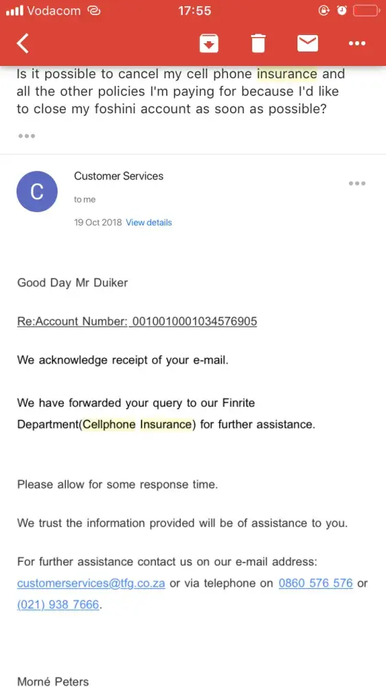 I have tried numerous times to cancel my cellphone insurance contract. I sent emails to ask to cancel the contract but all they say is they'll get back to me. It's been weeks now after the last email I sent. I would please like Foschini to add the money to my Foschini account, from the month of October until now. No one tried contacting since last year October. Attached is the emails I sent.