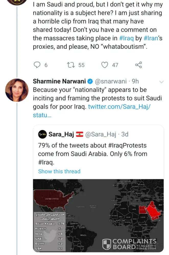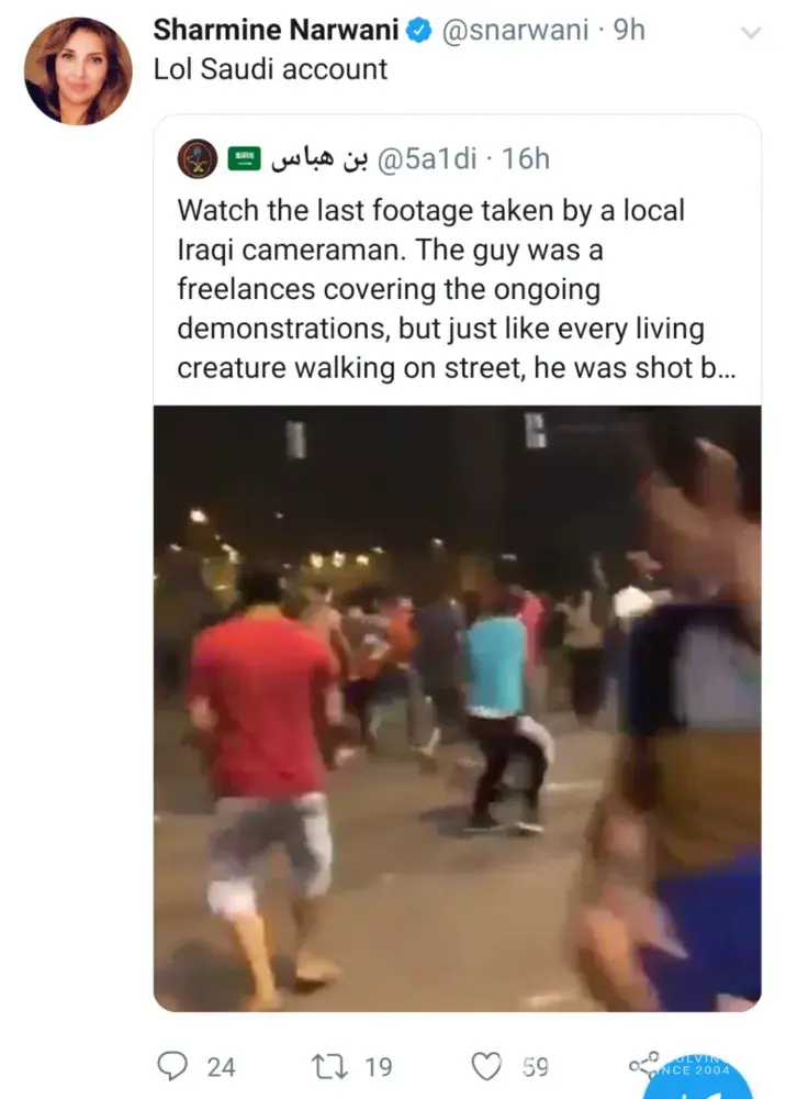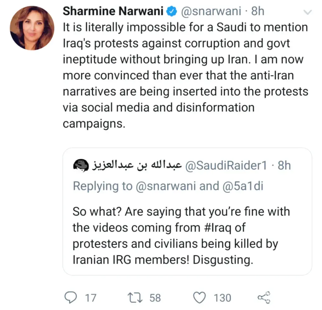 One of your reporters, Sharmine Narwani, tweeted anti-Saudi hate speech over false information, saying that Saudi Arabia was somehow staging the protests in Iraq for their own agenda, because most of the media shared was from Saudi Arabia, but this is only because Iraq's internet has been cut off and they are unable to post media of the protests. The kind of disrespect Narwani is treating people with is absolutely unacceptable and should have some kind of repercussions.