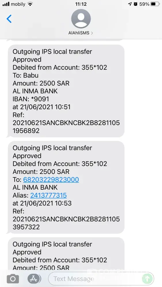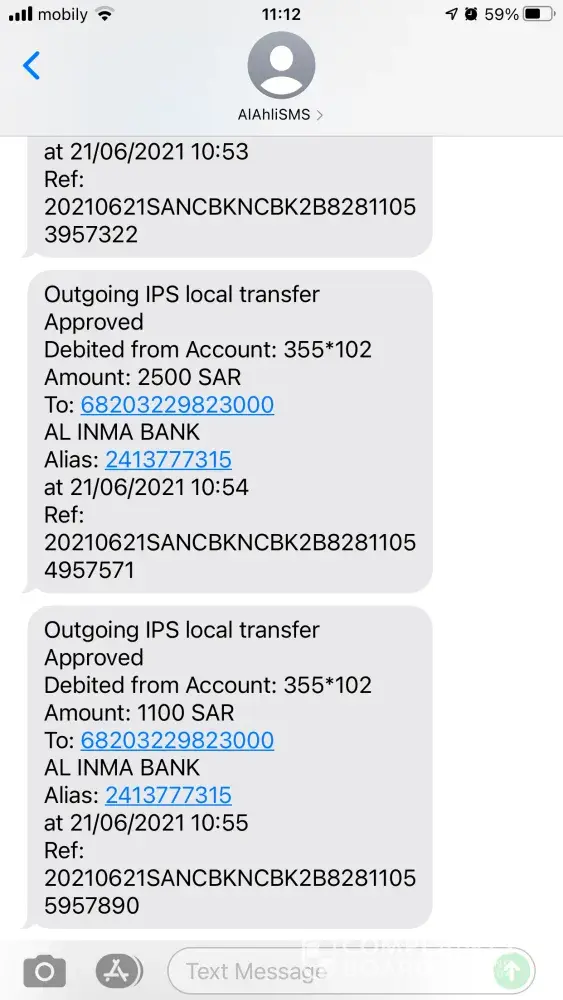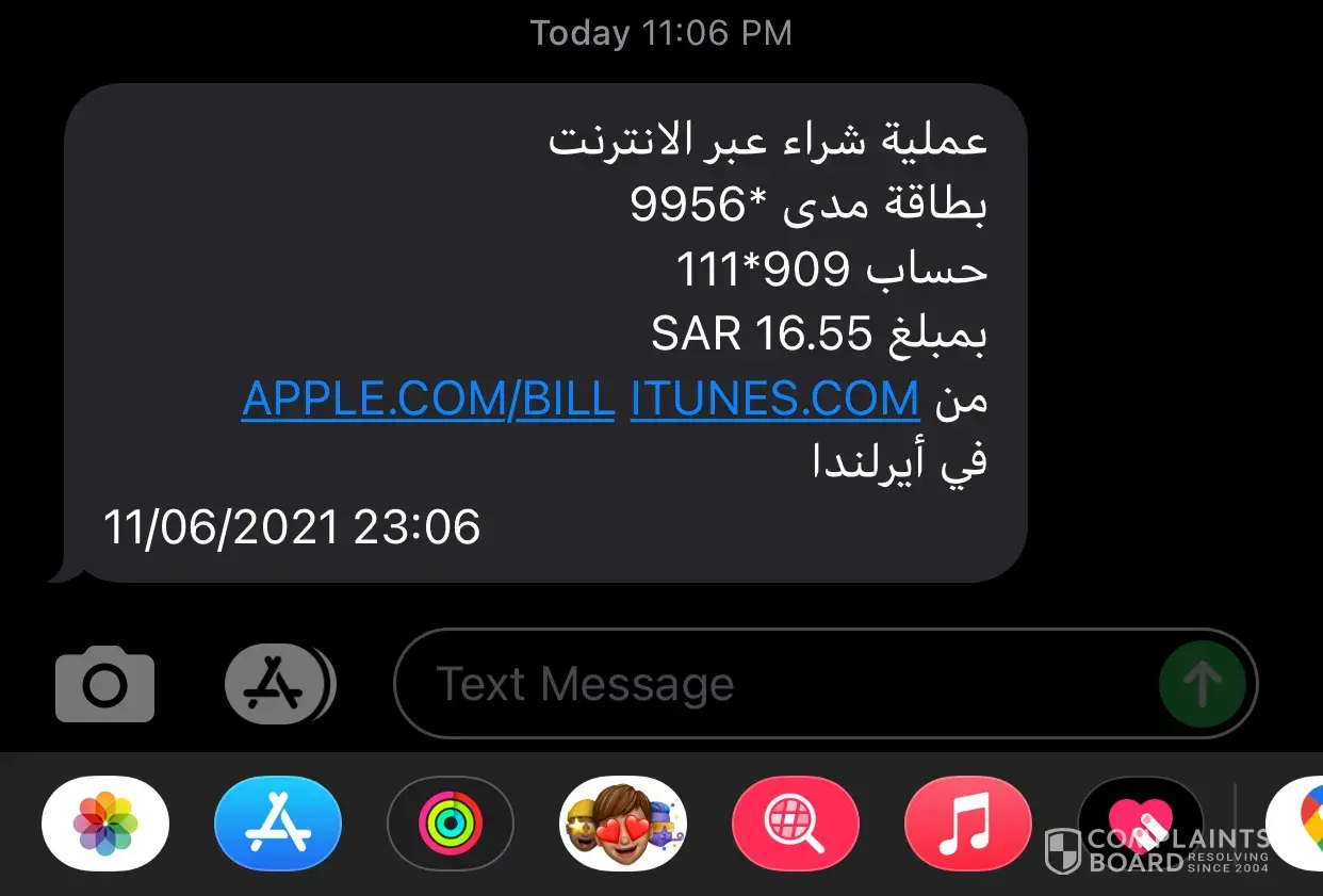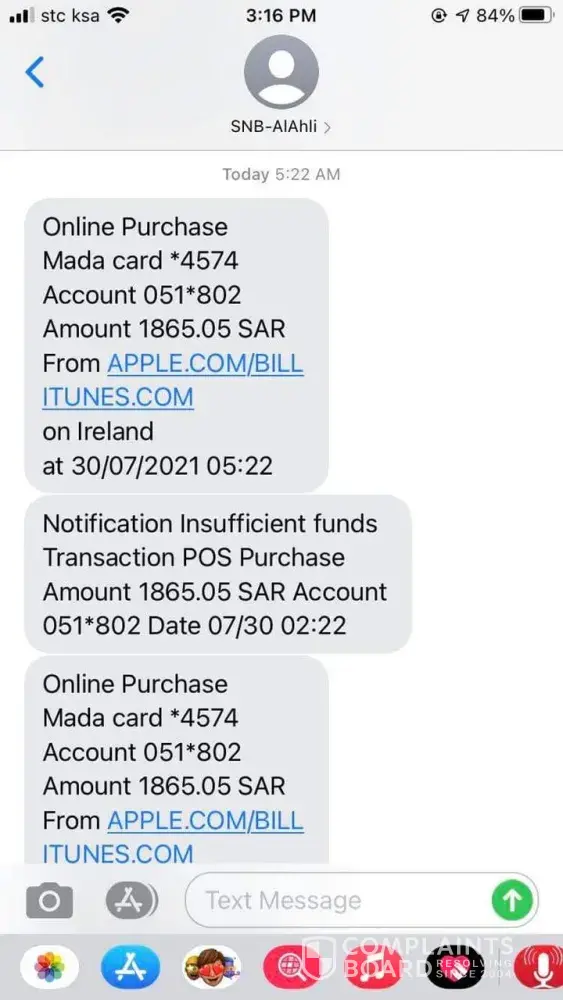 I woke up this morning with a message of: "Online Purchase Mada card *XXXX Account XXXX Amount 1865.05 SAR from APPLE.COM/BILL ITUNES.COM on Ireland at 30/07/2021 05:25". I have never purchased anything from apple, this sms received 5 times in my phone. And then when I checked my balance through NCB app, only did I found out that I was deducted of such amount 5 times costing me more than 9, 000 SR. I had already reported thru costumer service and received a message that they will come back to me after 2 months. This is very frustrating. I hope they will refund my money as I have bills to pay and family to feed.